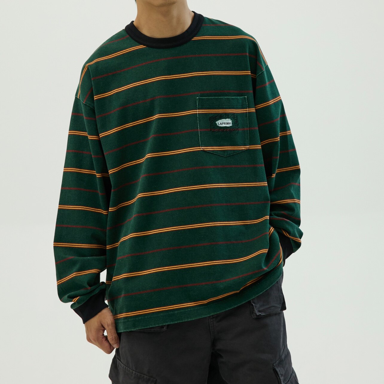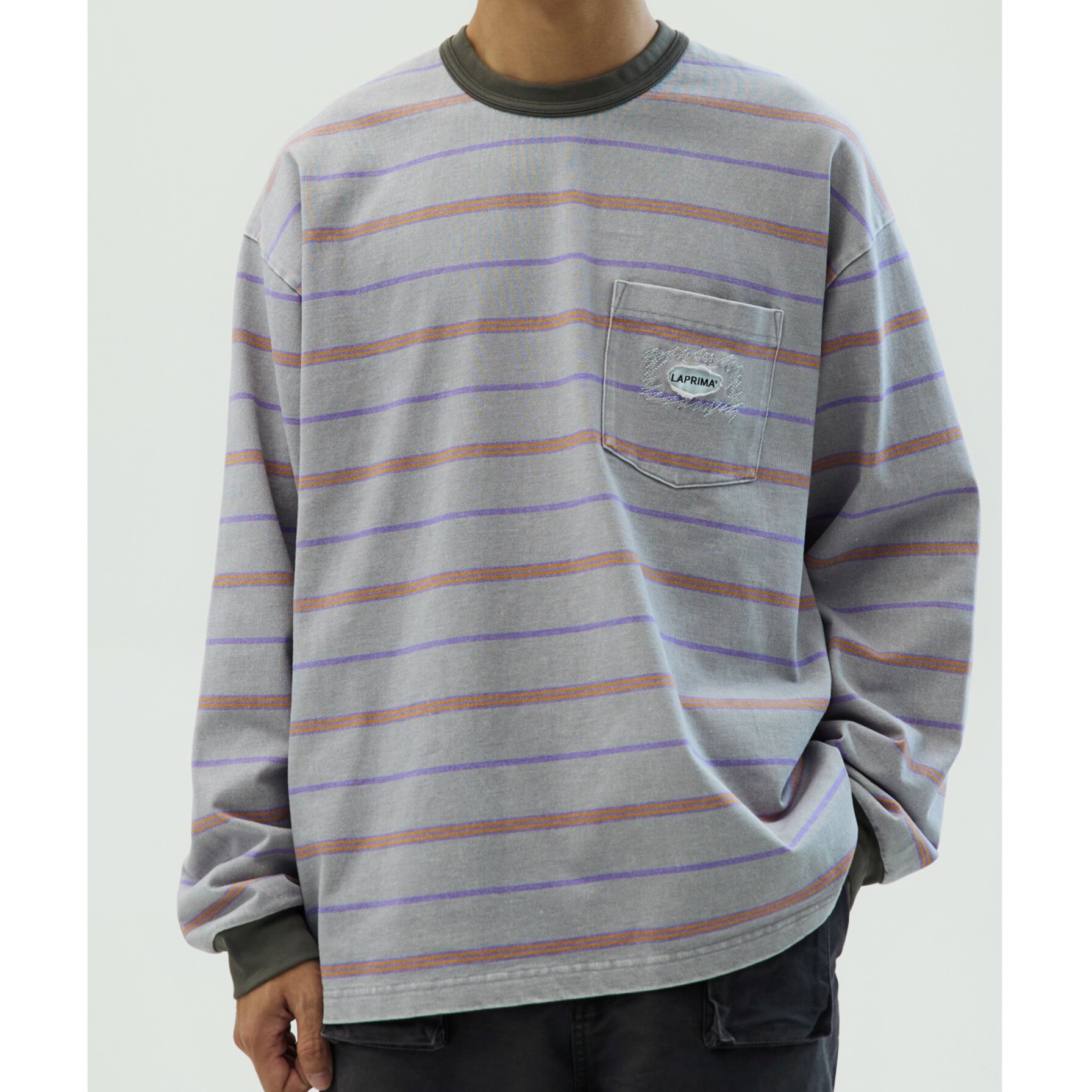 --------------------- 【极限清仓】LAPRIMA 条纹长袖圆领水洗做旧破坏日系复古T恤秋 【原售价】399元 【现售价】87.1元 【推荐理由】
