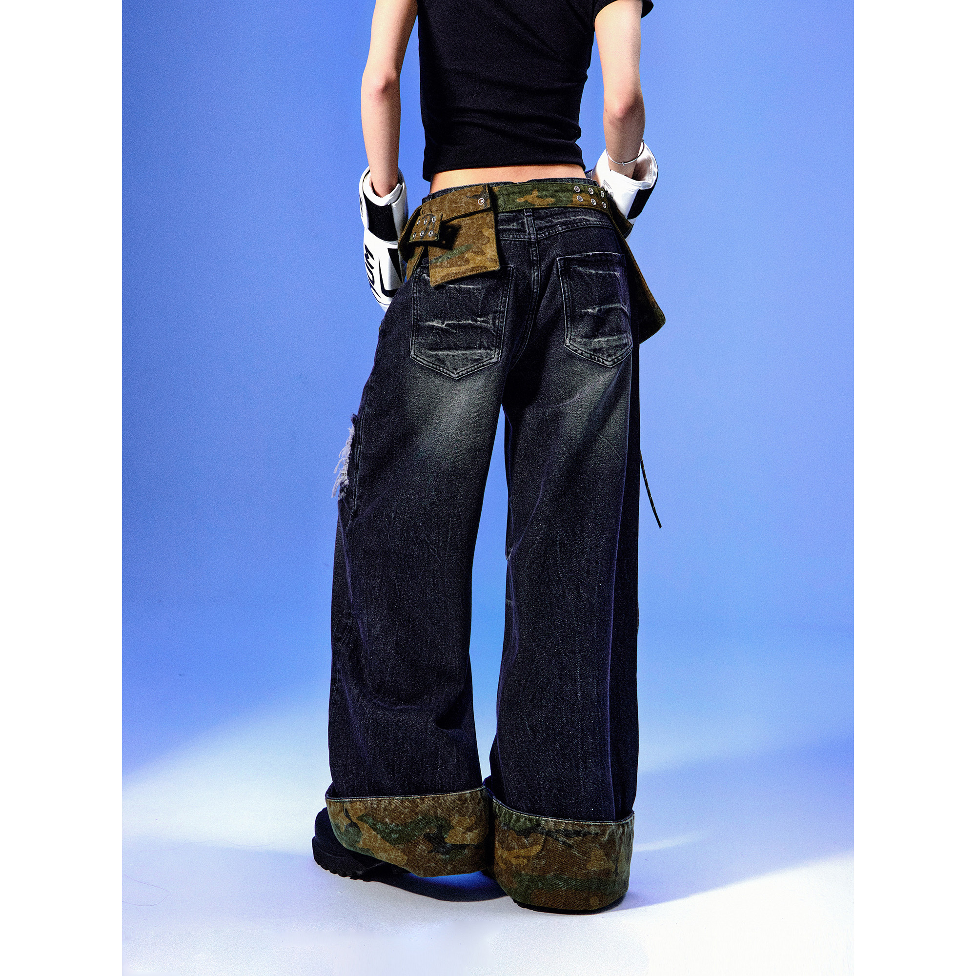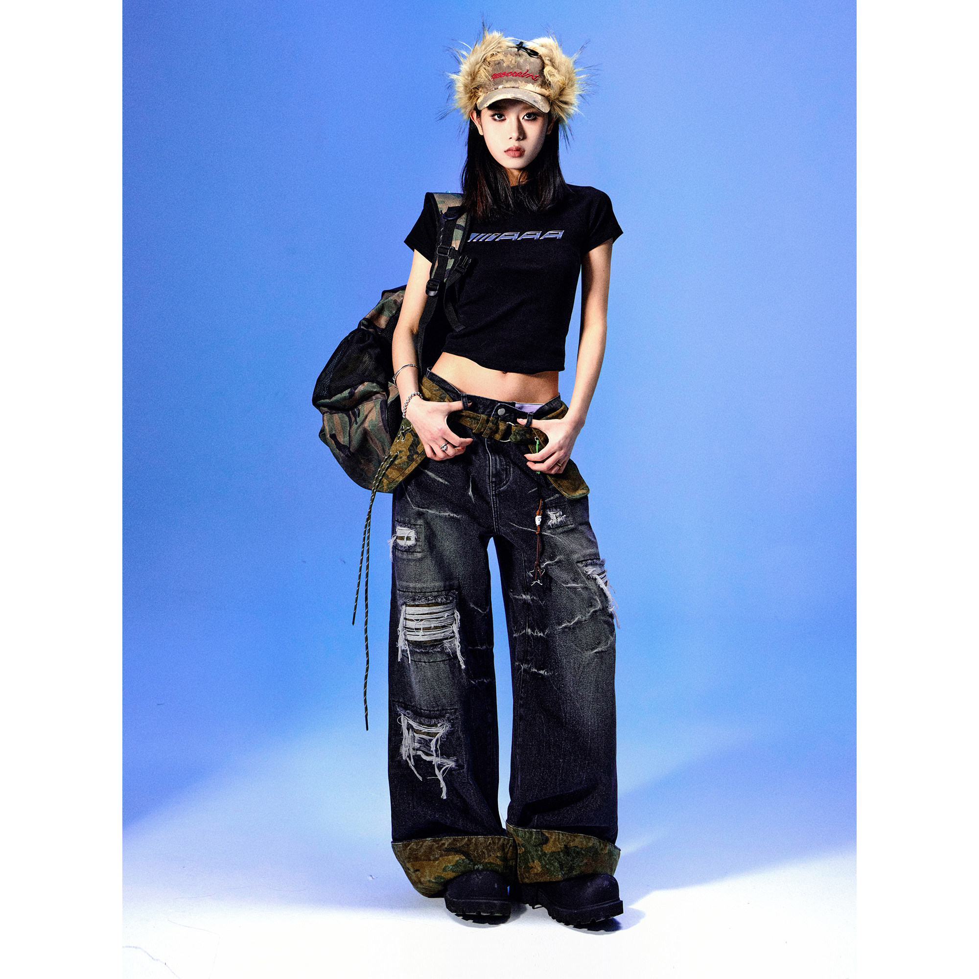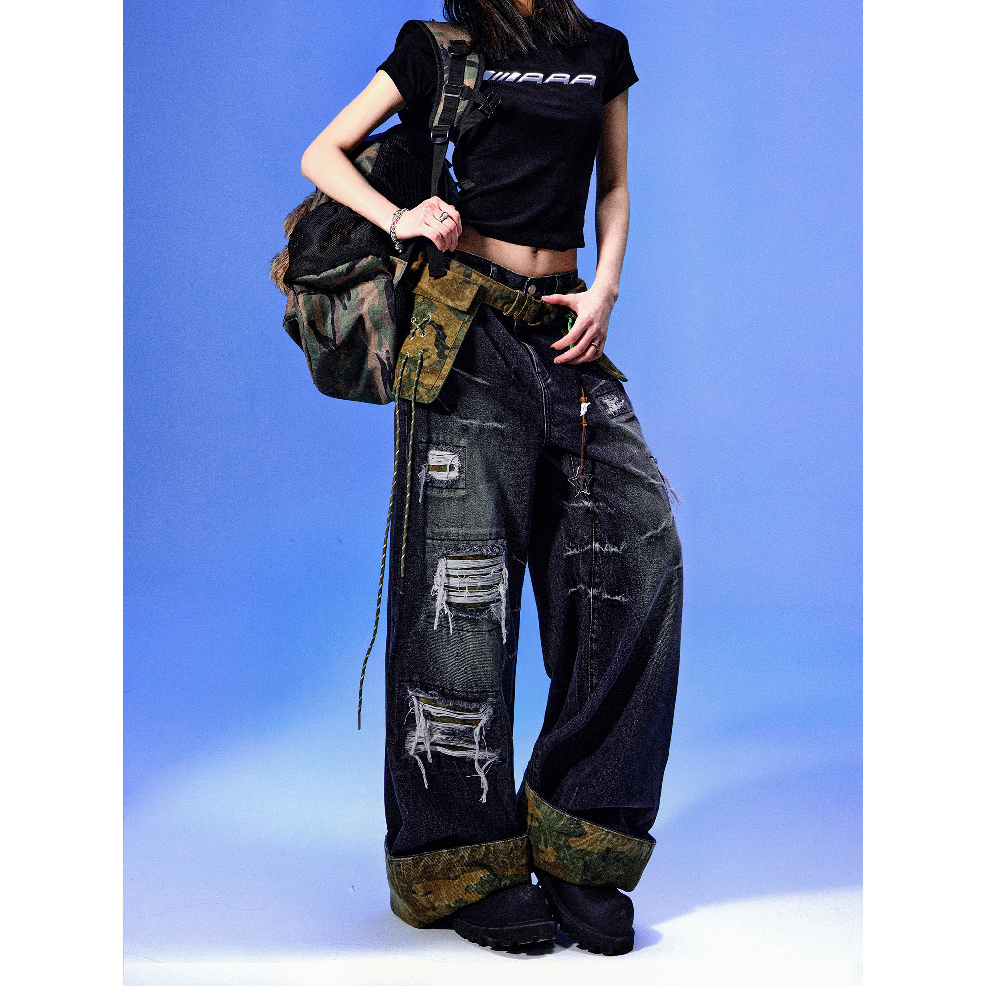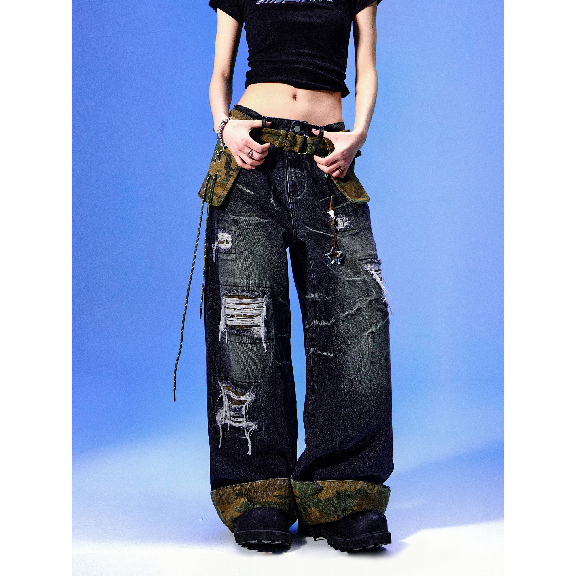 梁拌泡菜国潮迷彩贴布裤直筒破洞牛仔裤嘻哈宽松裤子男女潮春