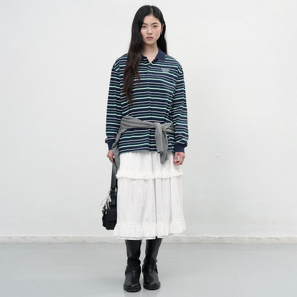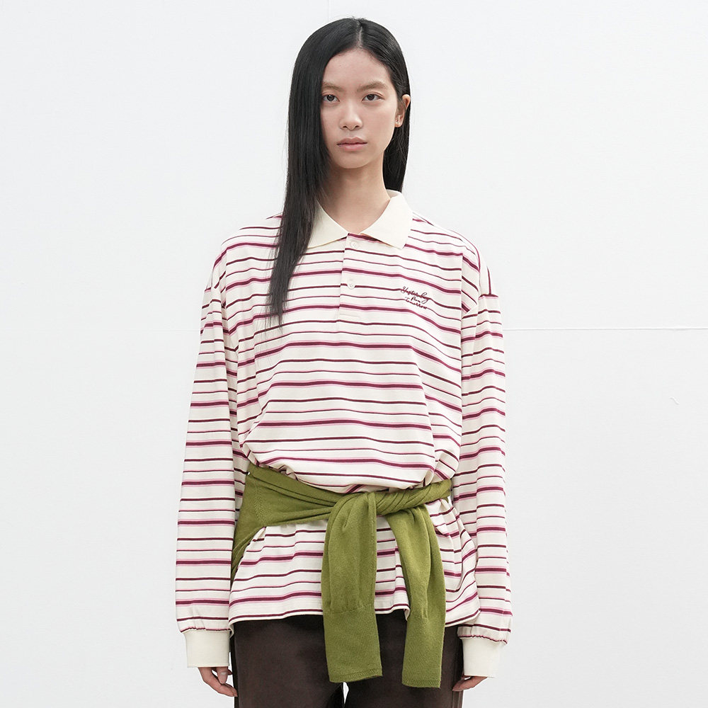 【现】General idea运动复古条纹POLO领T恤长袖休闲宽松韩上衣女