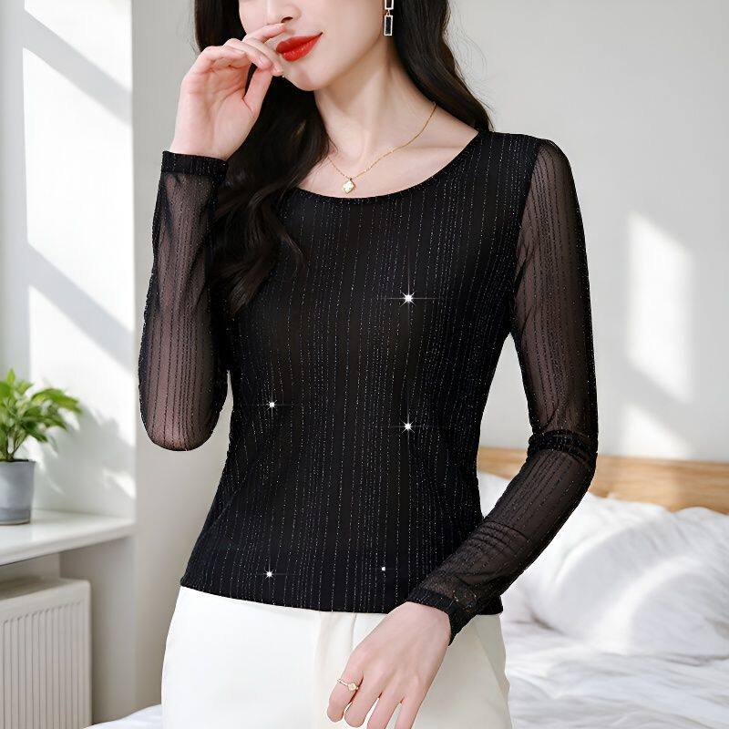 优雅减龄网纱T恤小衫女2026春秋季修身显瘦打底衫高级感蕾丝上衣