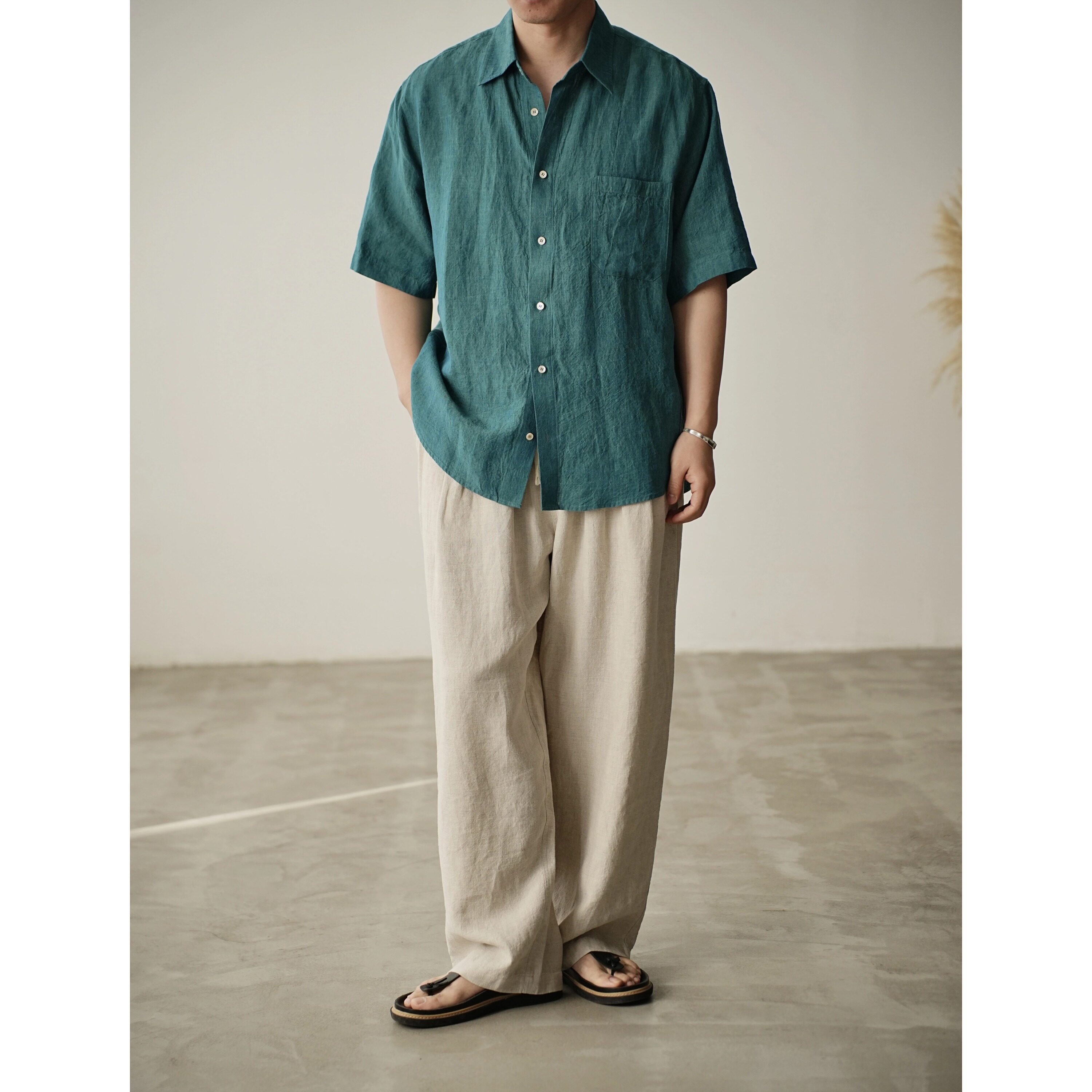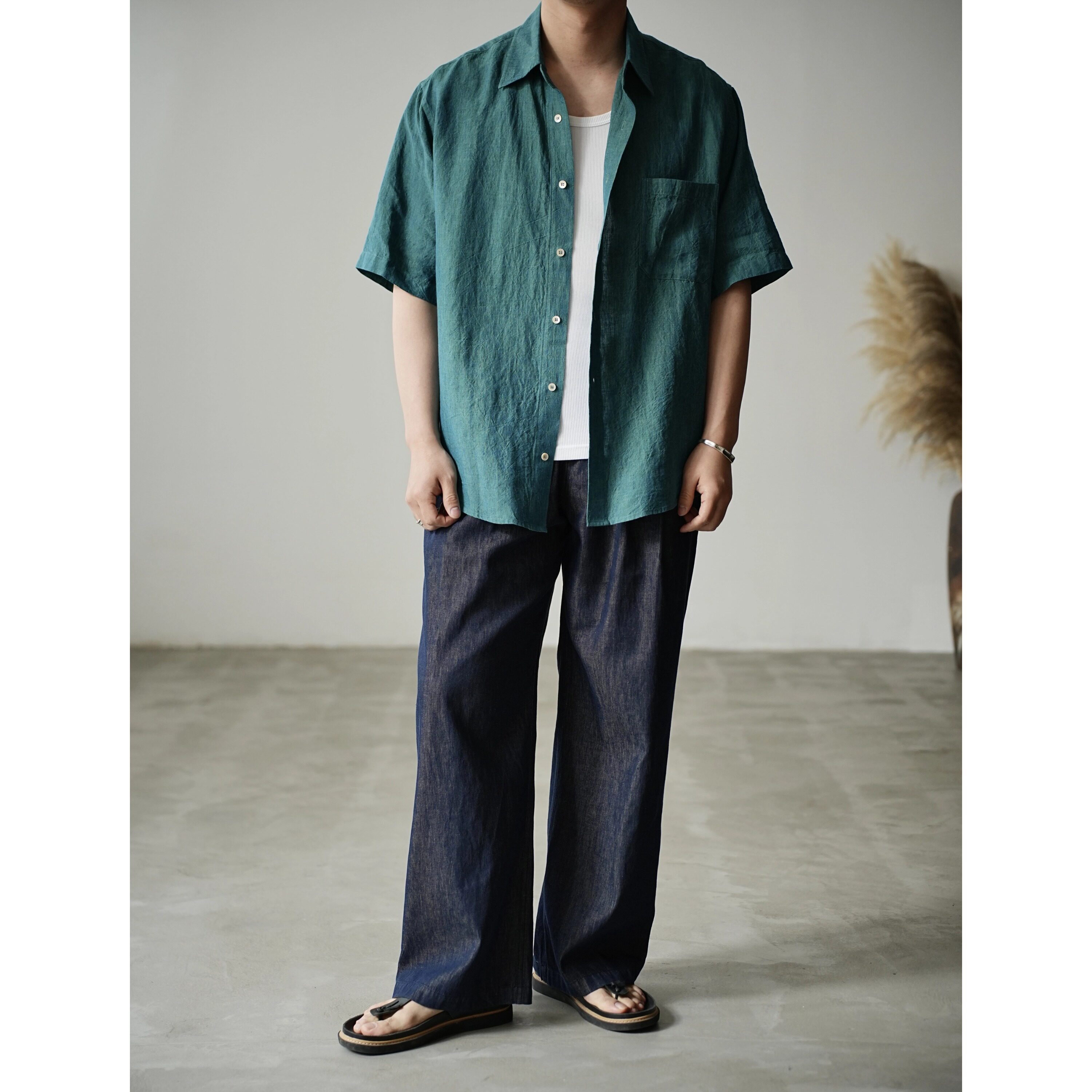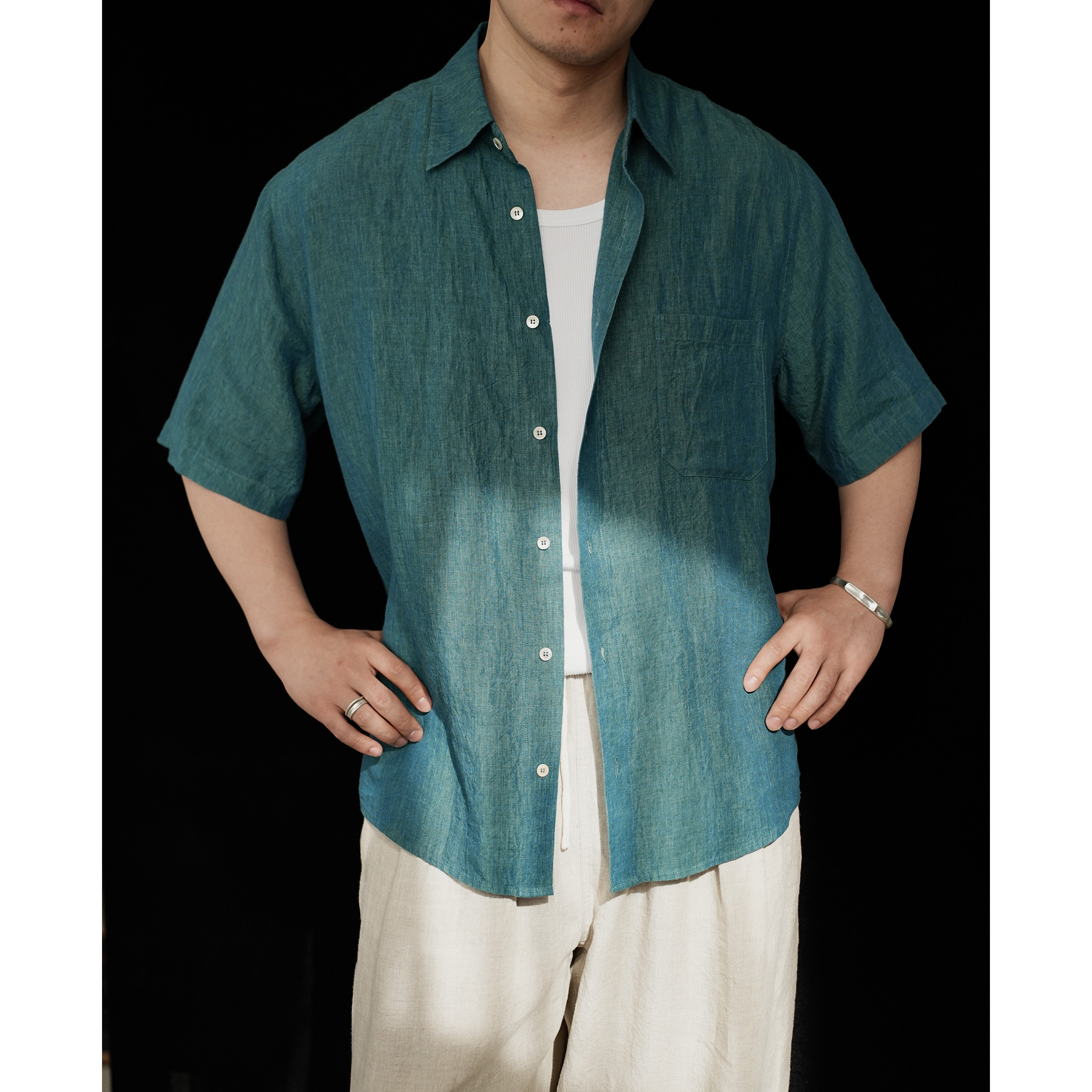 WATEREVER「晴朗」湖蓝色纯亚麻色织短袖衬衫 清新透气防晒衬衣