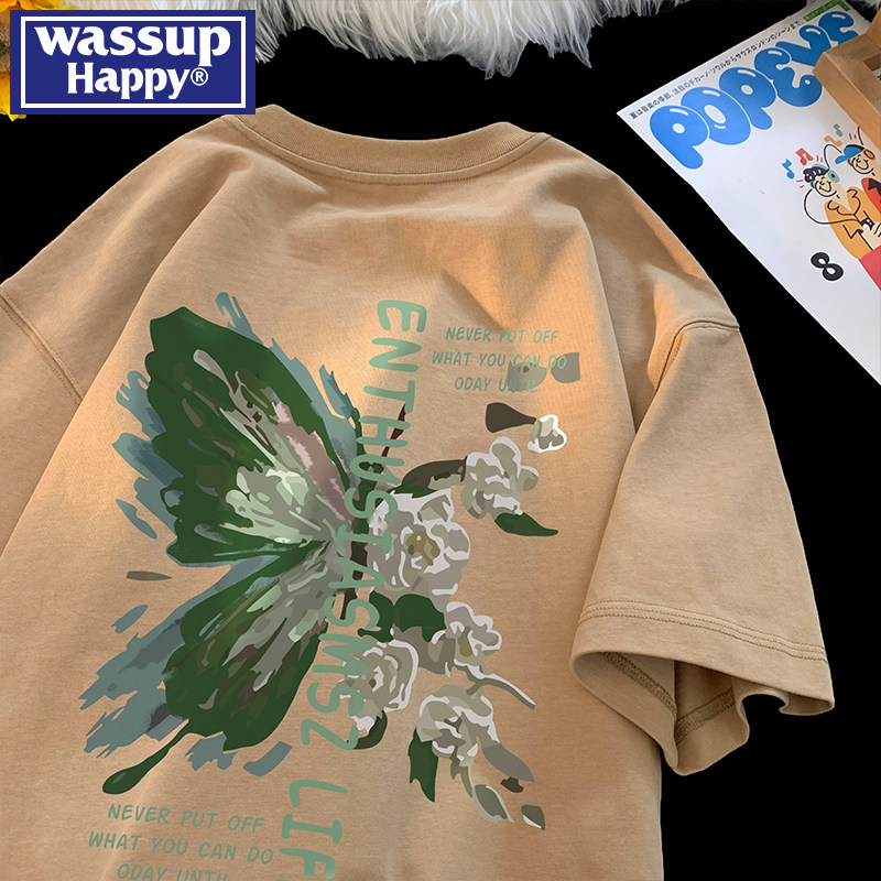 wassup happy蝴蝶印花纯棉短袖t恤男士夏季薄款宽松圆领半袖体恤