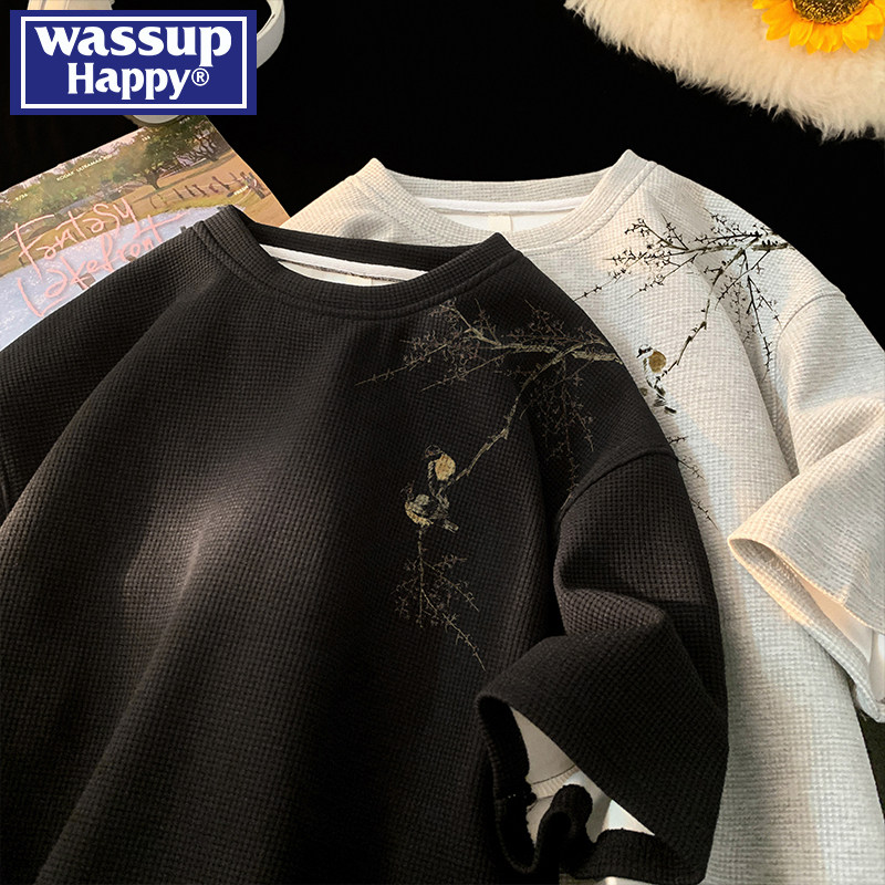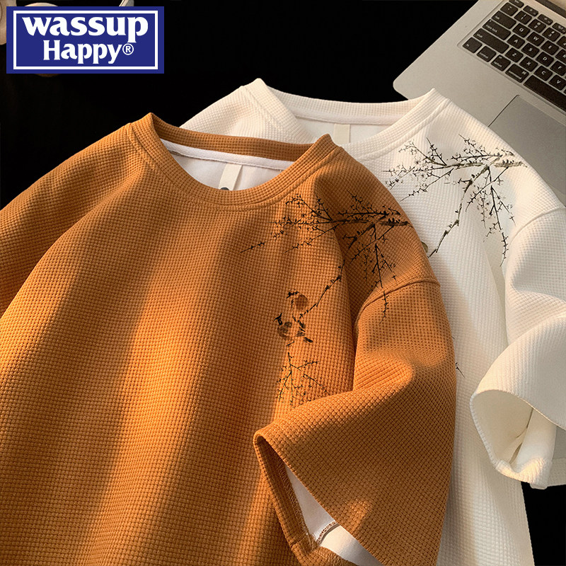 wassup happy华夫格短袖t恤男士夏季薄款新中式国风宽松半袖体恤