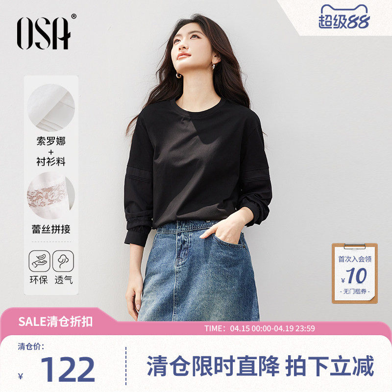 --------------------- OSA欧莎白色薄款T恤女士长袖宽松女装2026年新款春季蕾丝拼接上衣 【原售价】199元 【现售价】122元 【推荐理由】