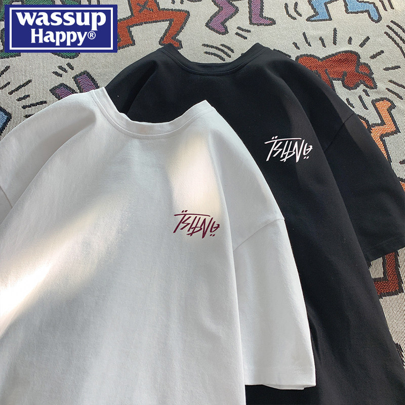 wassup happy日系纯棉短袖t恤男夏季2026新款青少年宽松圆领半袖
