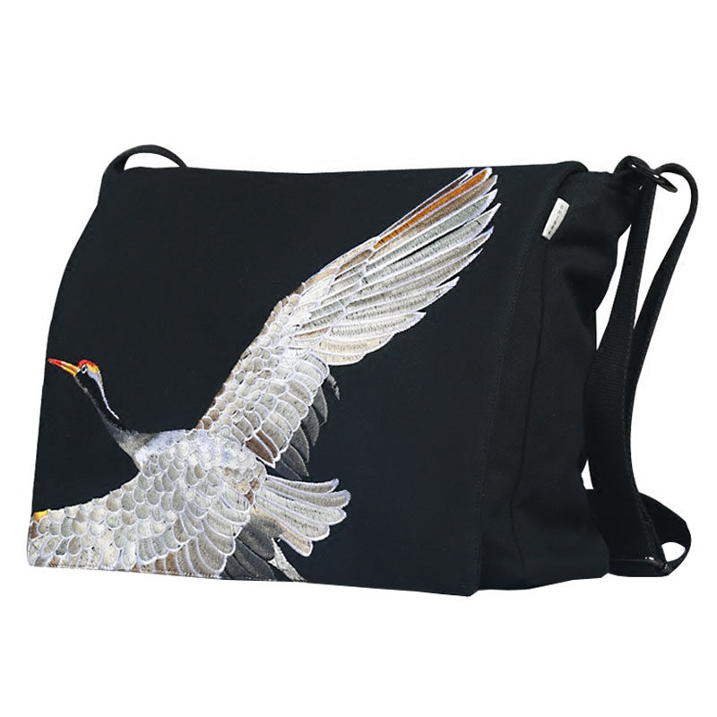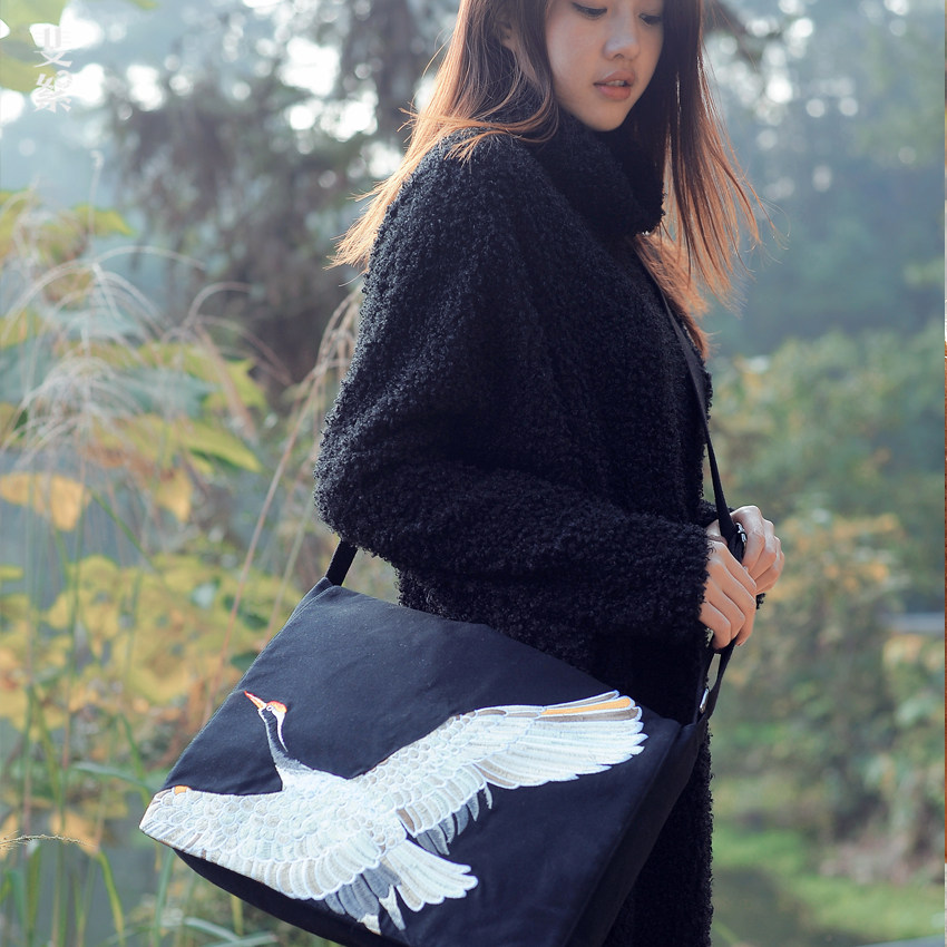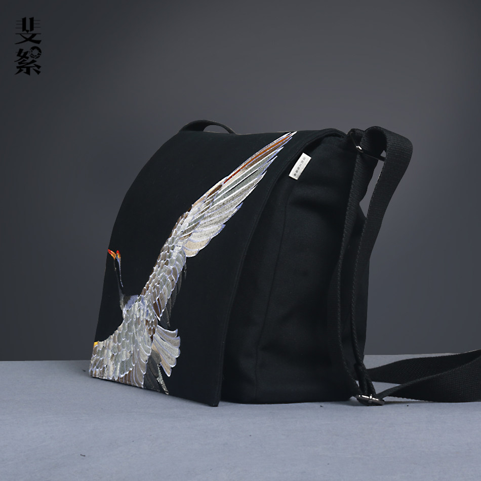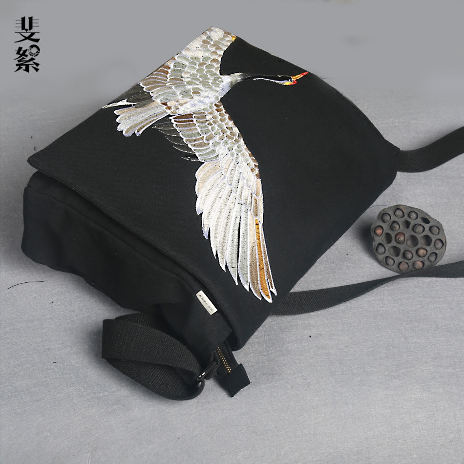 斐絮原创中国风刺绣仙鹤细纹帆布斜跨单肩包男女同款布包