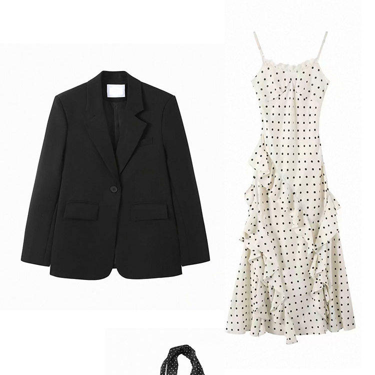 早春女装2026新款长款吊带波点连衣裙西装韩系一整套ootd穿搭长裙