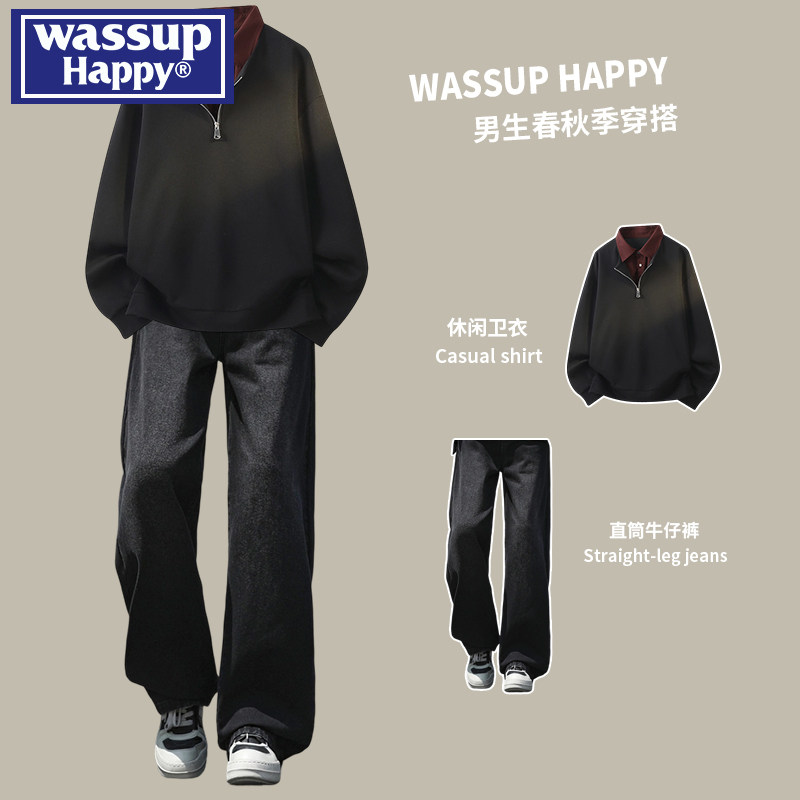 wassup happy假两件衬衫领卫衣男春秋季新款痞帅牛仔裤搭配一整套
