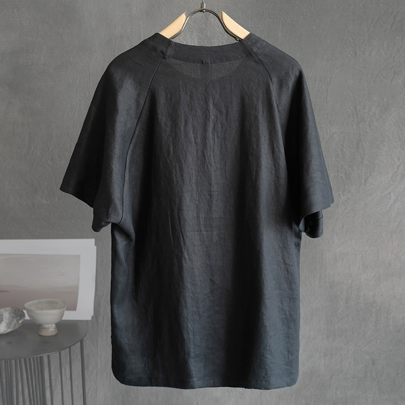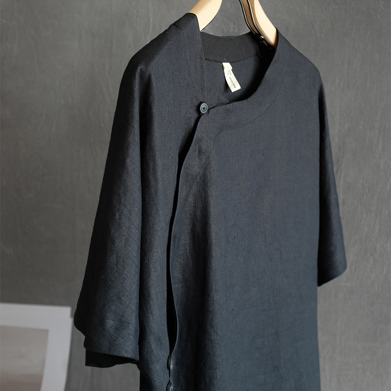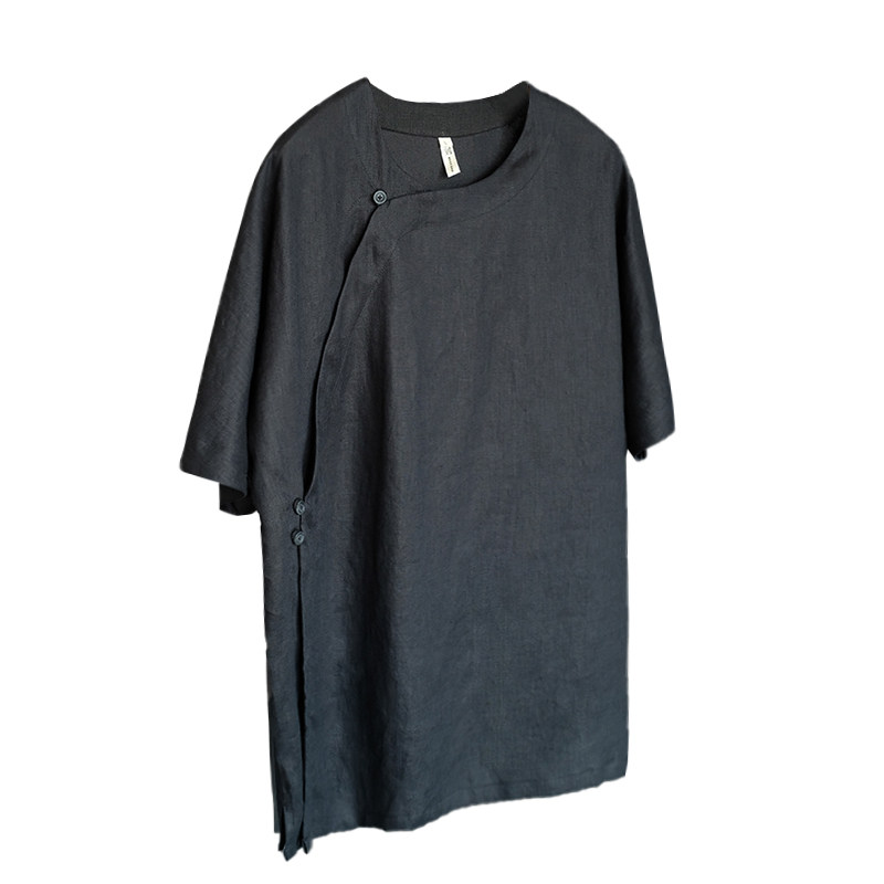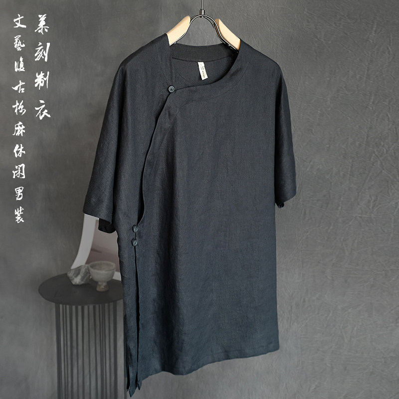 夏季男士亚麻休闲宽松薄款透气短袖t恤青年潮流斜肩汉服短袖衫