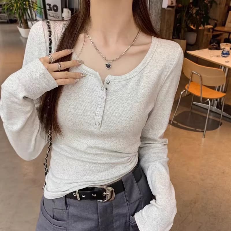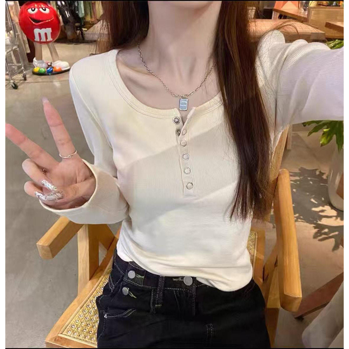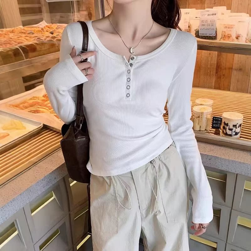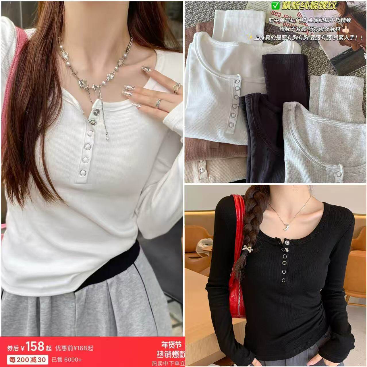 04/18W 品牌!精致排扣!人棉JU好穿2026修身长袖t恤螺纹上衣2231