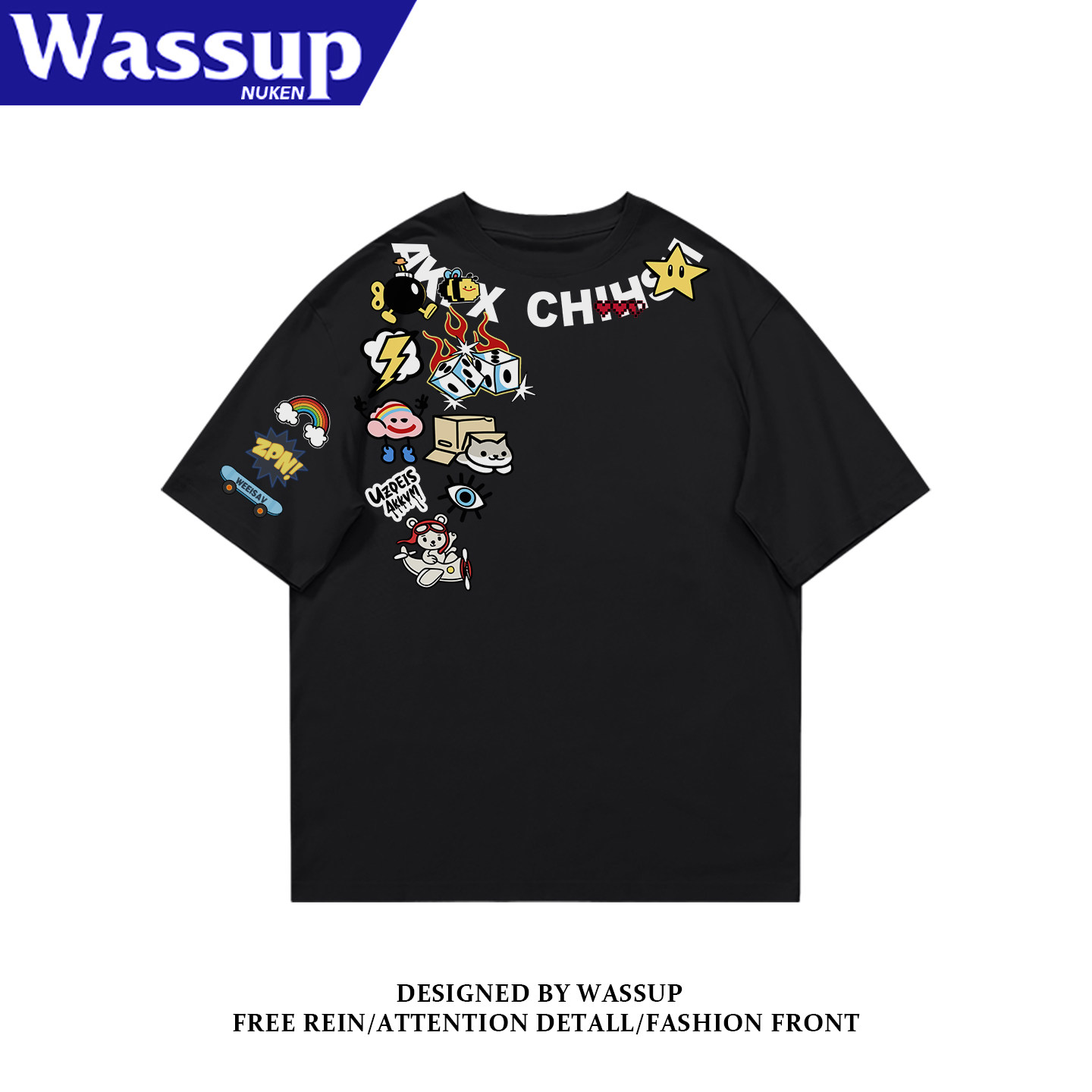 WASSUP国潮牌原创美式短袖男纯棉街头字母印花小众痞帅夏季半袖潮