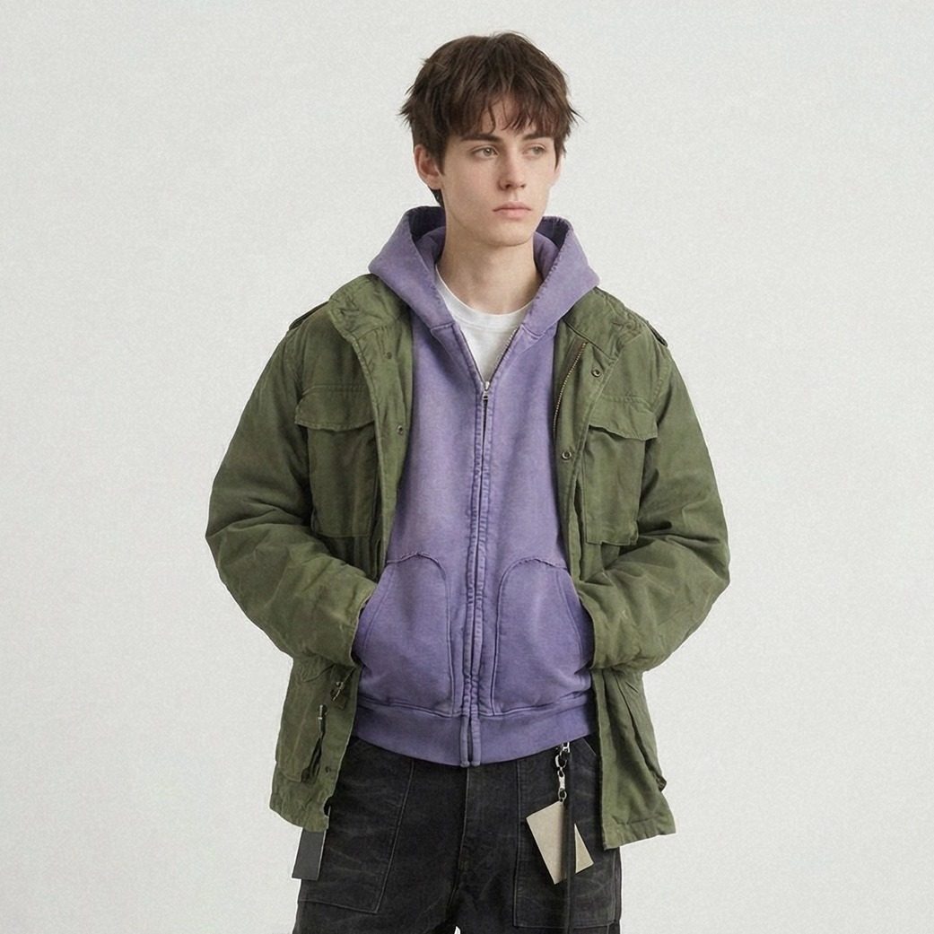 --------------------- ATHIRI 美式复古猎装M65洗水做旧涂鸦外套宽松多口袋连帽工装夹克 【原售价】638元 【现售价】561元 【推荐理由】