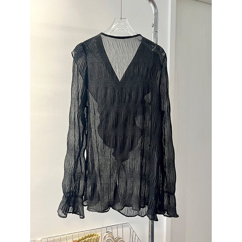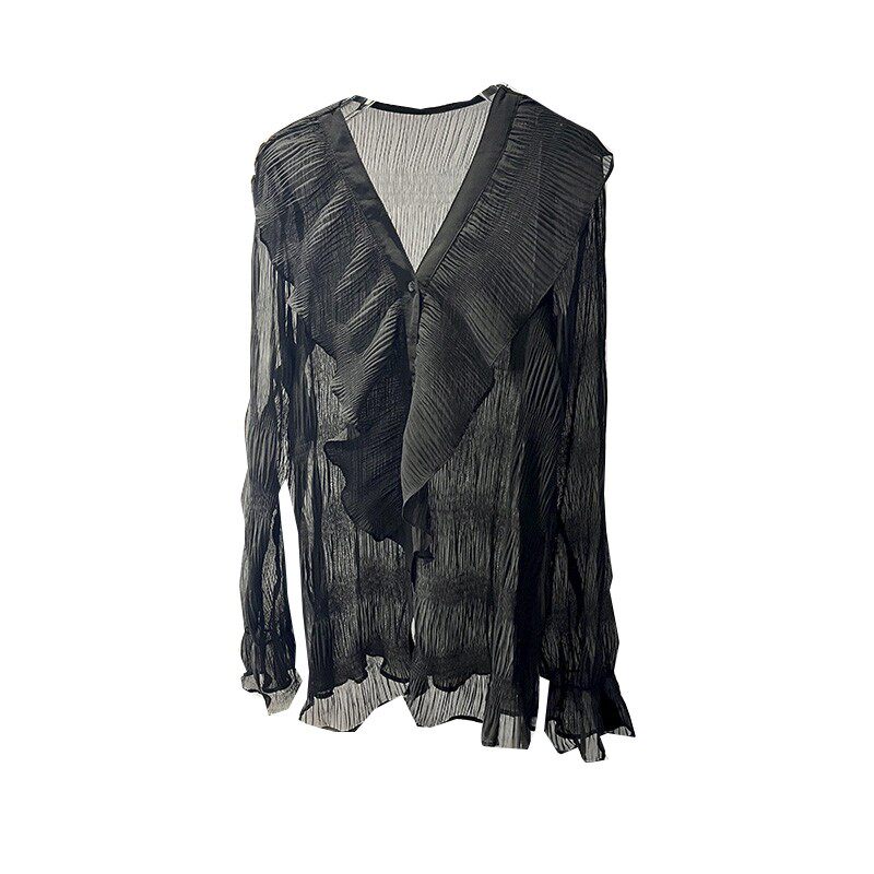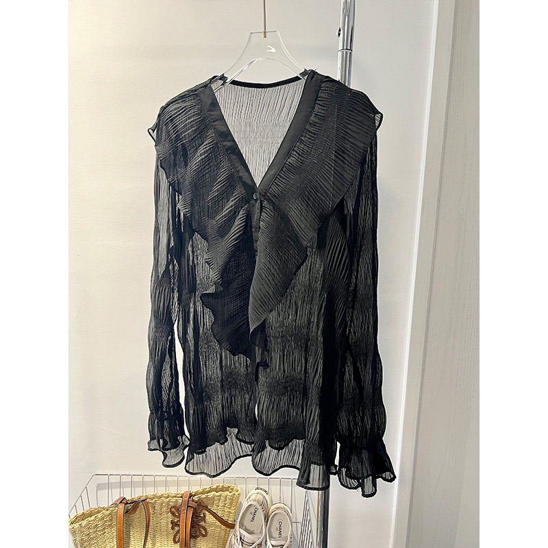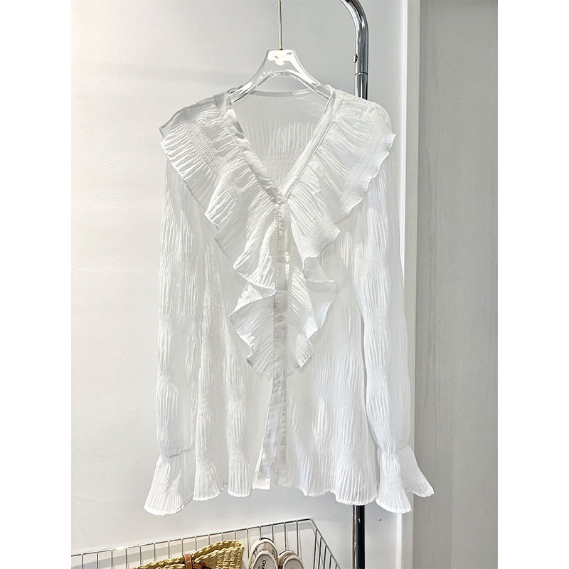 夏装新款法式高级感甜美荷叶边长袖V领褶皱雪纺衬衫女防晒上
