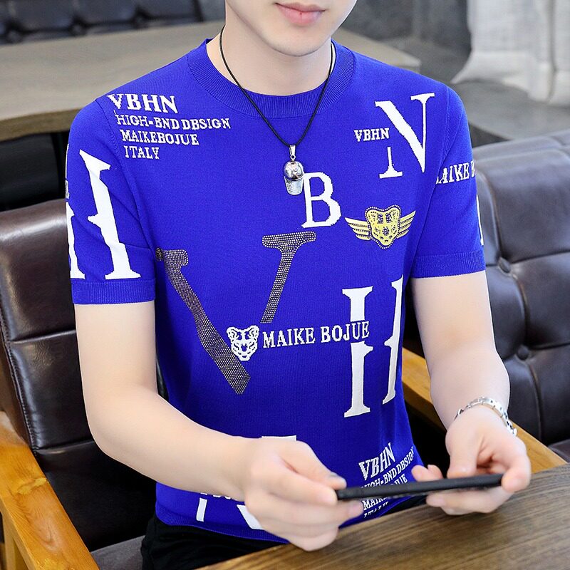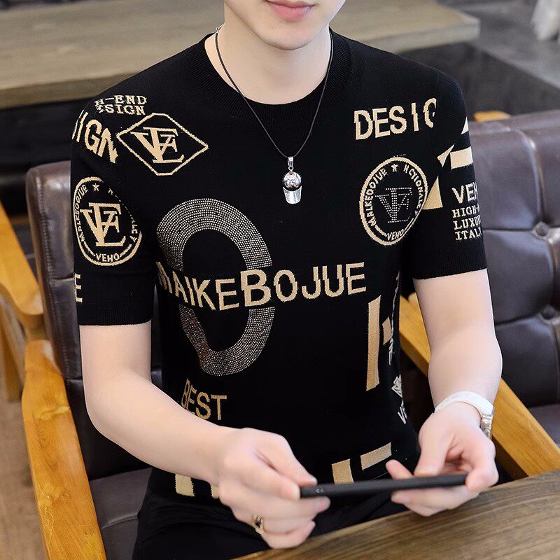 高端潮牌短袖T恤男夏季冰丝薄款圆领修身男士潮流烫钻针织衫半袖