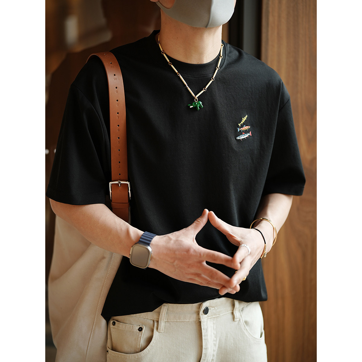 原创三条小鱼精致绣标圆领短袖T恤男士夏季新款潮牌极简风短袖衫