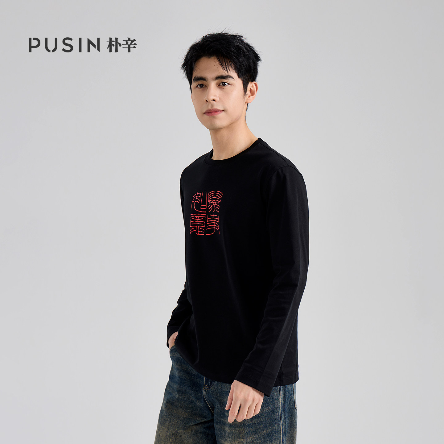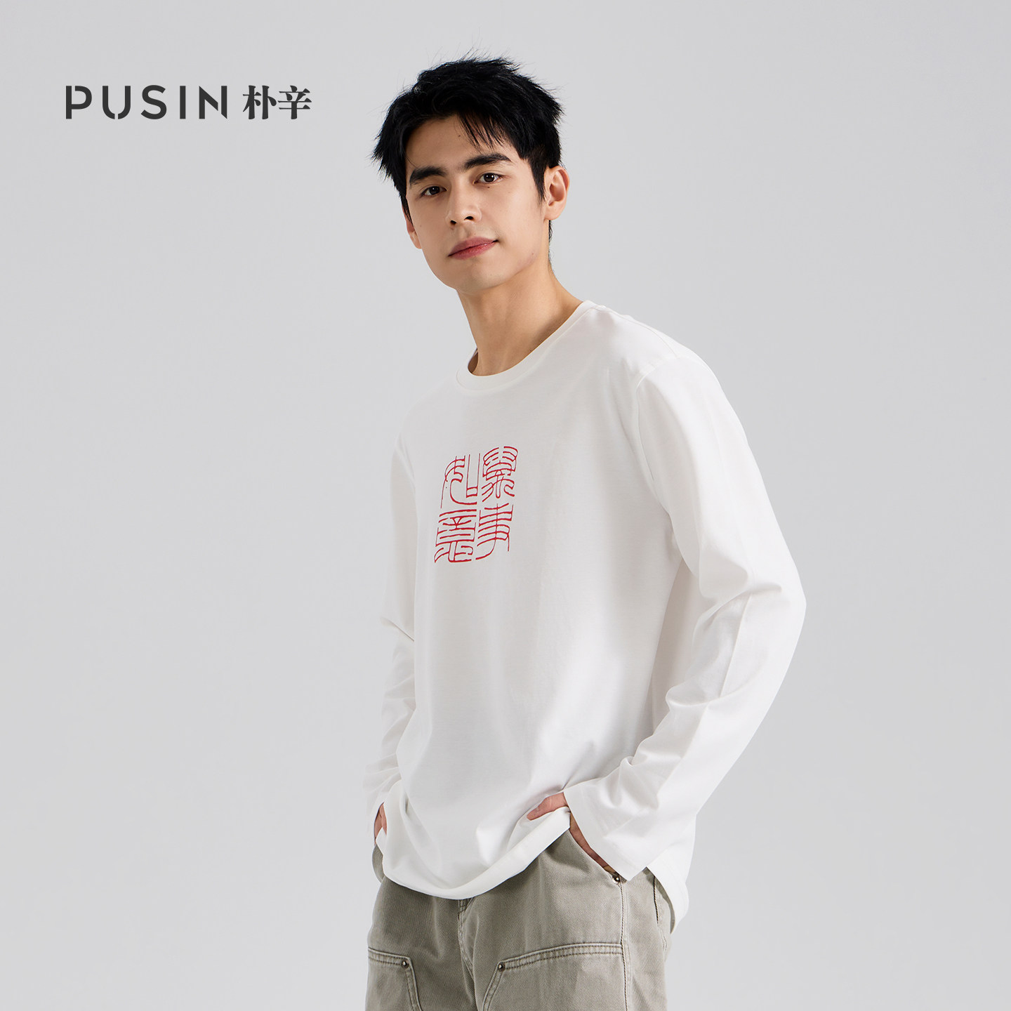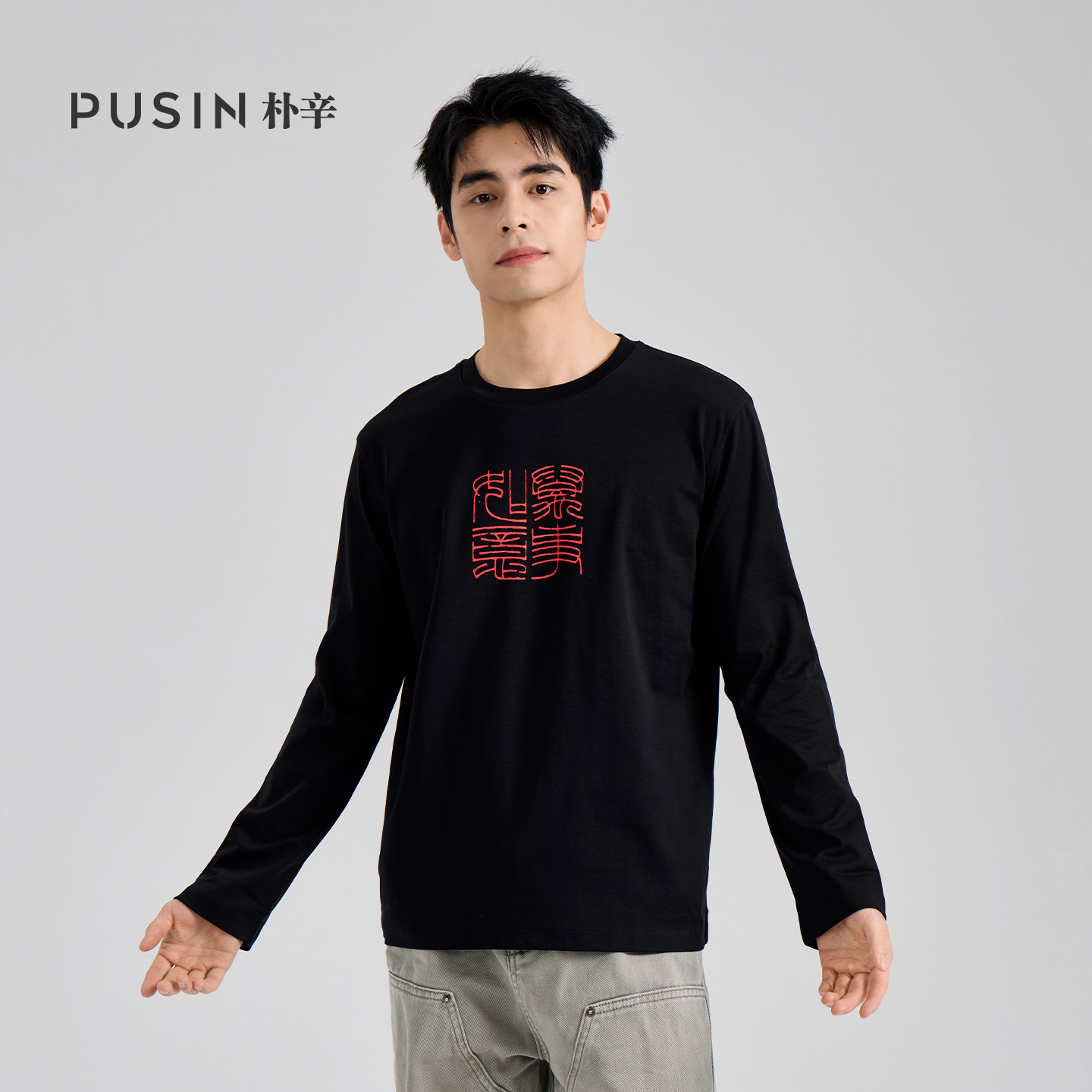 PUSIN朴辛【篆刻系列】薄款长袖T恤男士全棉透气亲肤圆领休闲打底