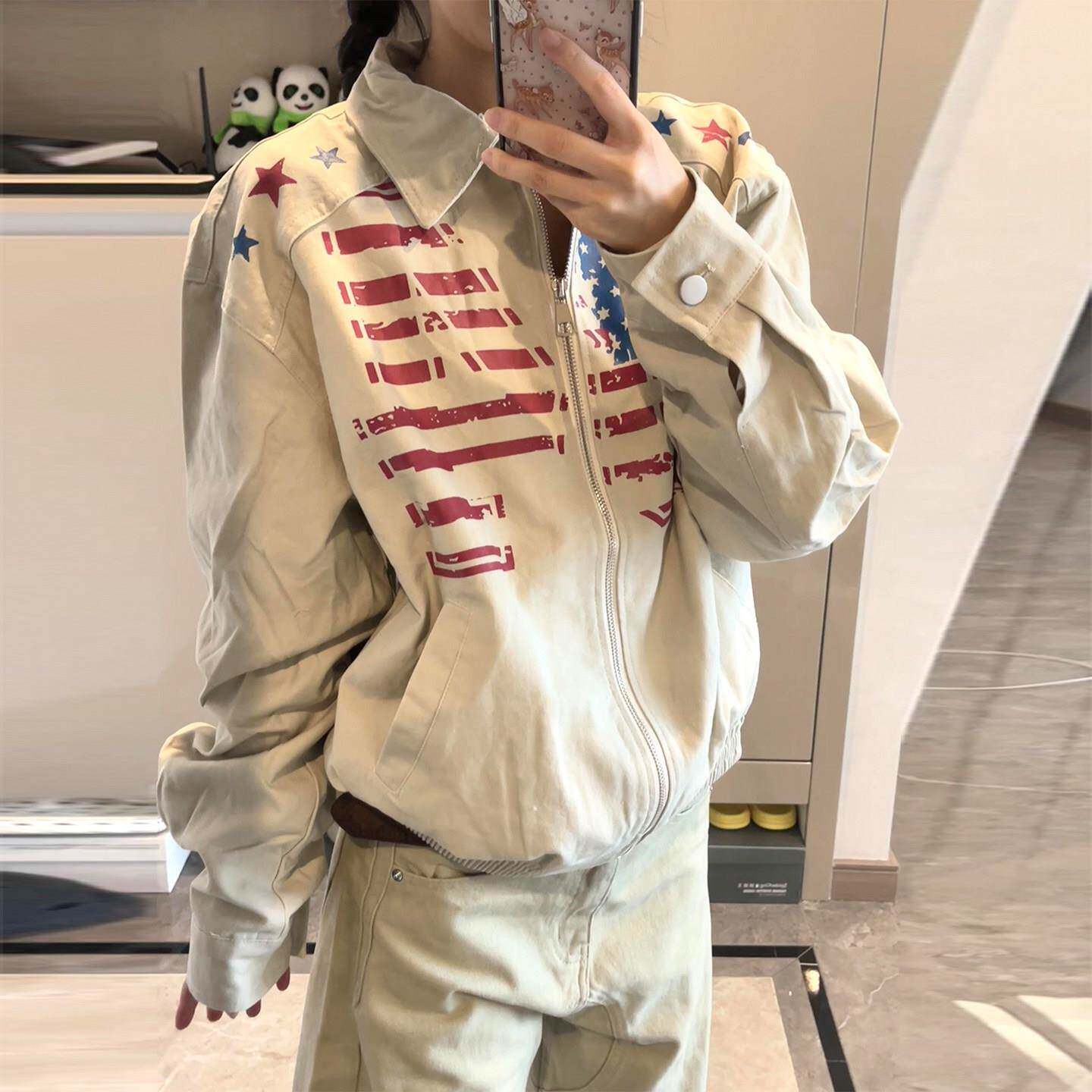 美式复古夹克外套女秋冬宽松开衫翻领上衣设计感印花百搭国潮长袖