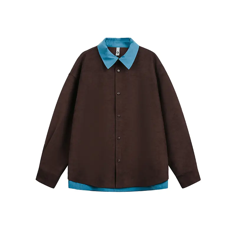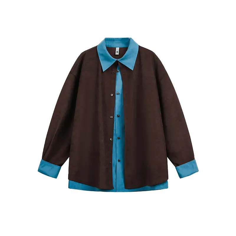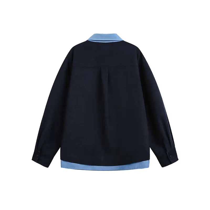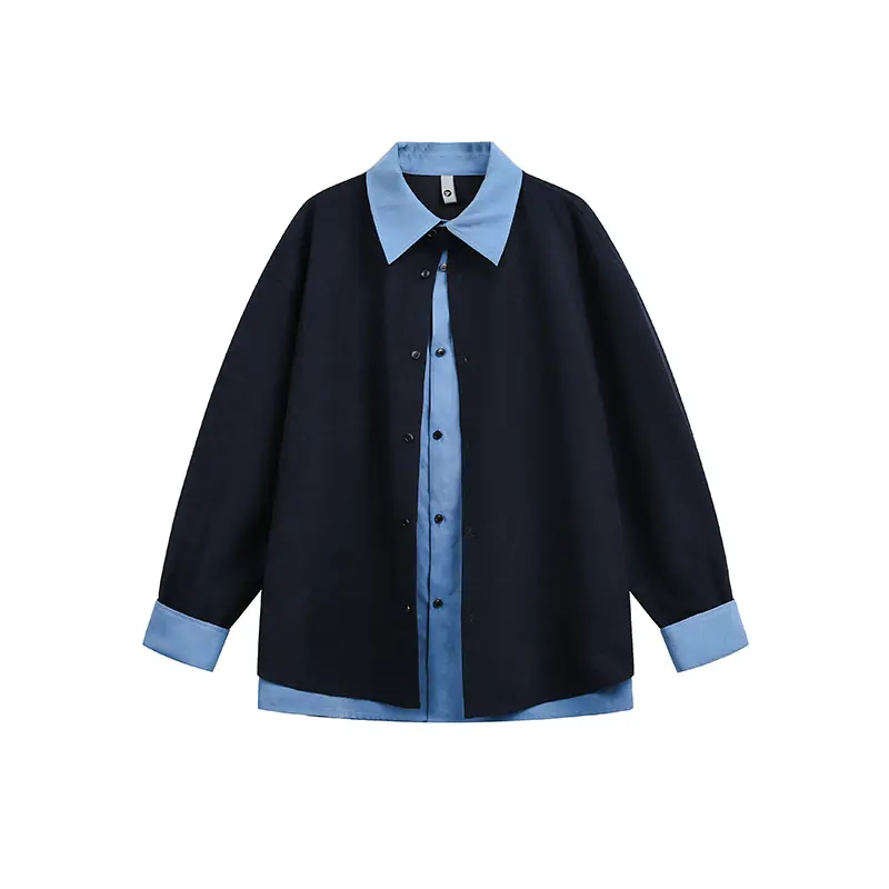 休闲长袖春季假两件拼接宽松痞帅撞色长袖衬衫男女同款