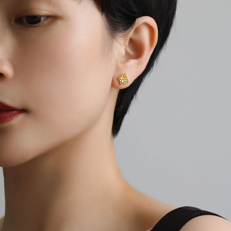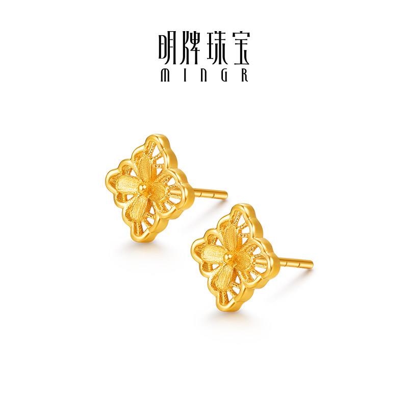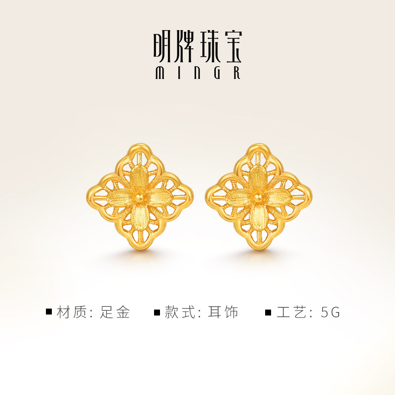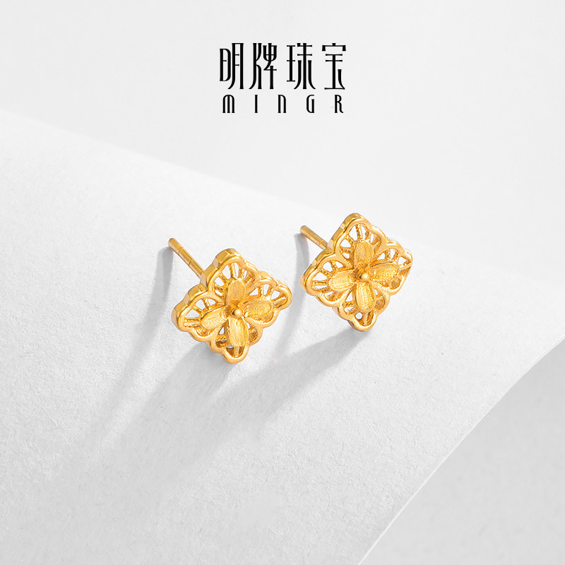 明牌珠宝5G黄金桂花窗耳钉 足金镂空窗花新中式国潮耳饰AFH0448