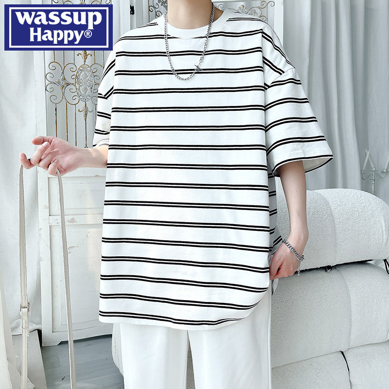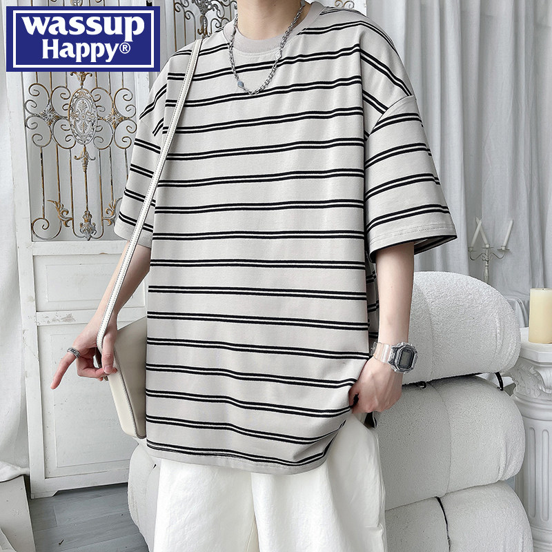 wassup happy重磅短袖t恤男夏季宽松拼接半袖潮流休闲小领口上衣