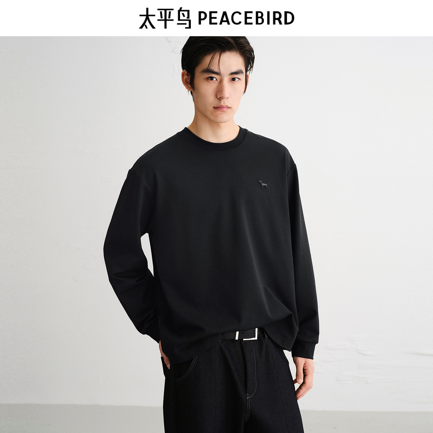 太平鸟男装T恤春秋季纯色重磅小狗刺绣长袖宽松肌理打底衫潮