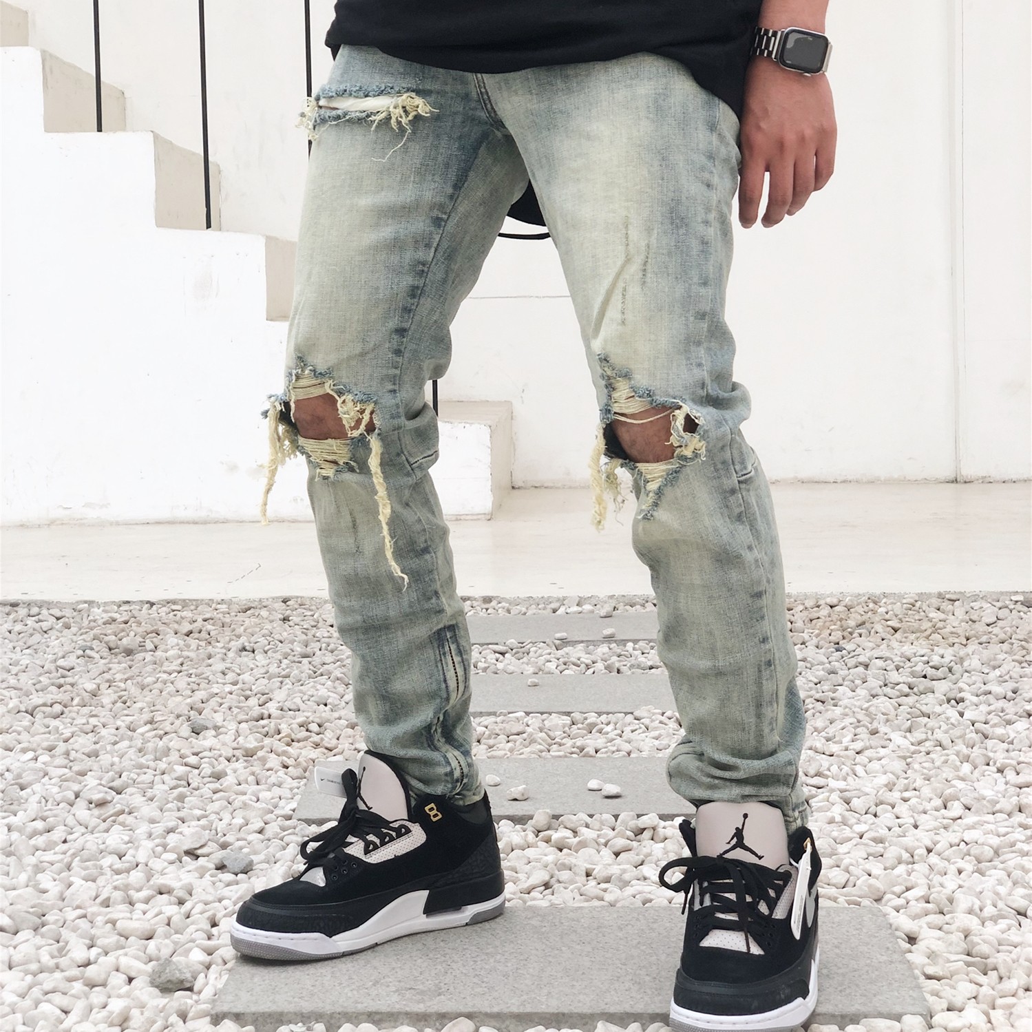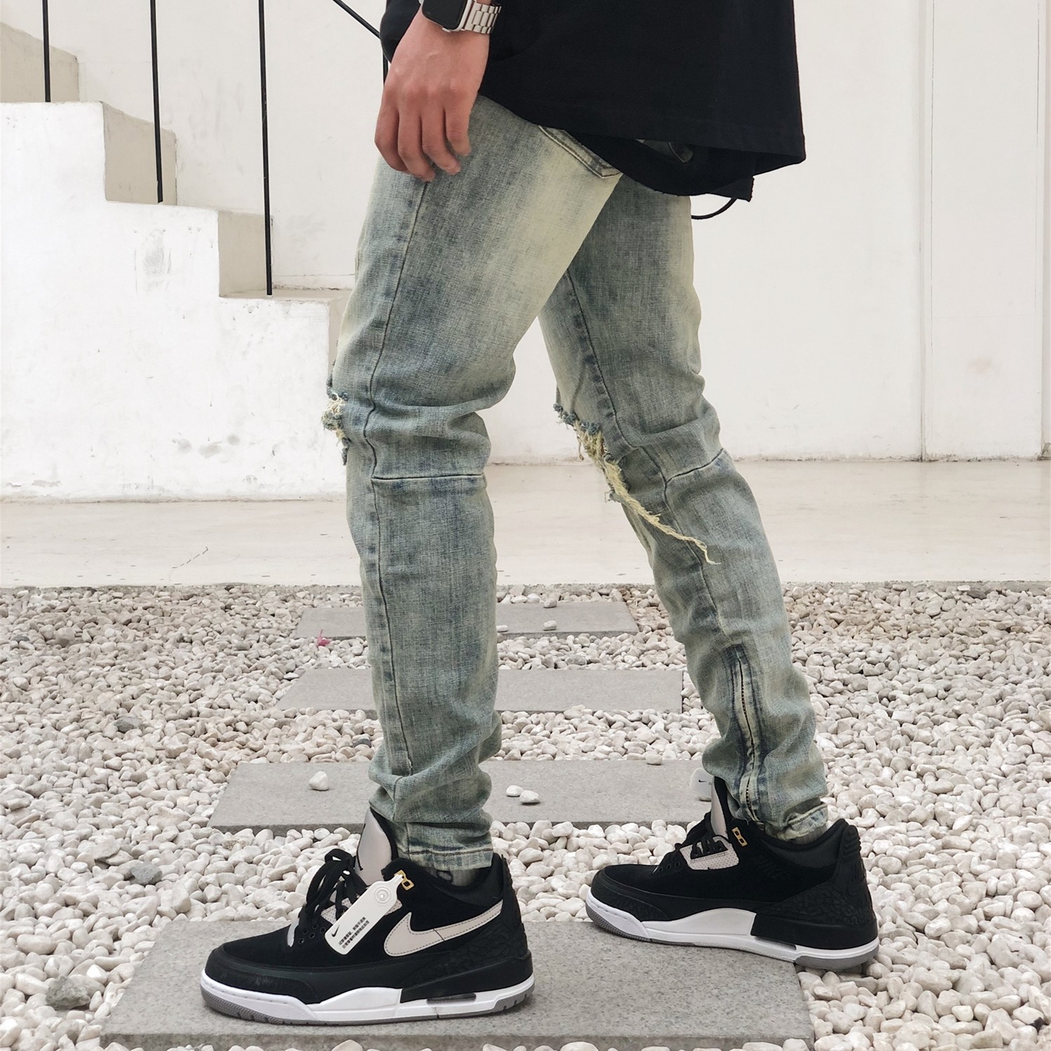 AKAMA新款高街kanye破洞裤潮流复古泛黄破坏修身小脚拉链牛仔裤男