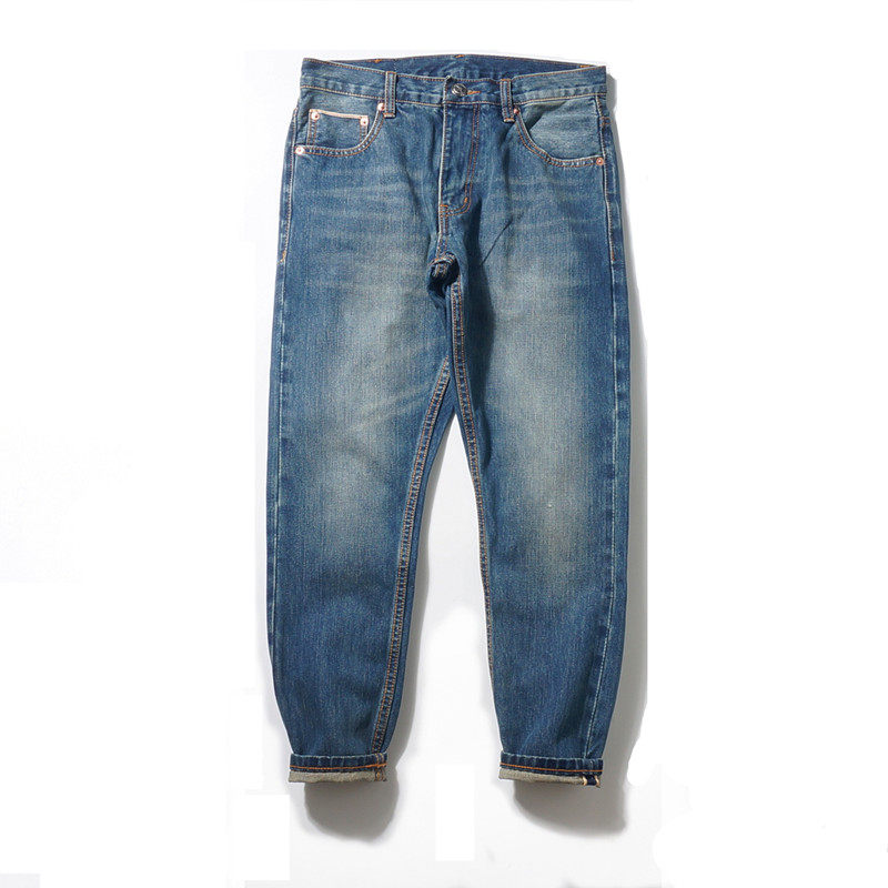 国潮蓝色手工洗水红边布9分小脚直筒修身悠闲赤耳丹宁牛仔裤酱潮
