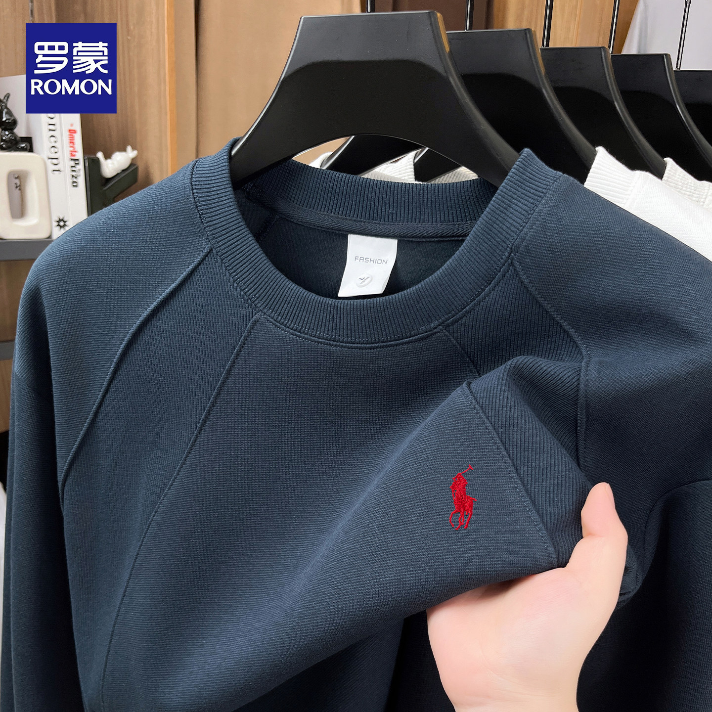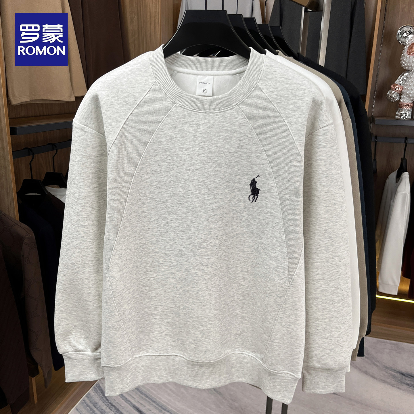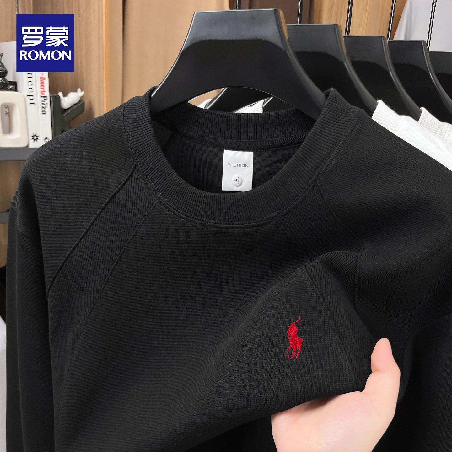 淘宝罗蒙2026春秋新款纯棉男士卫衣圆领休闲宽松潮流刺绣长袖T恤上衣