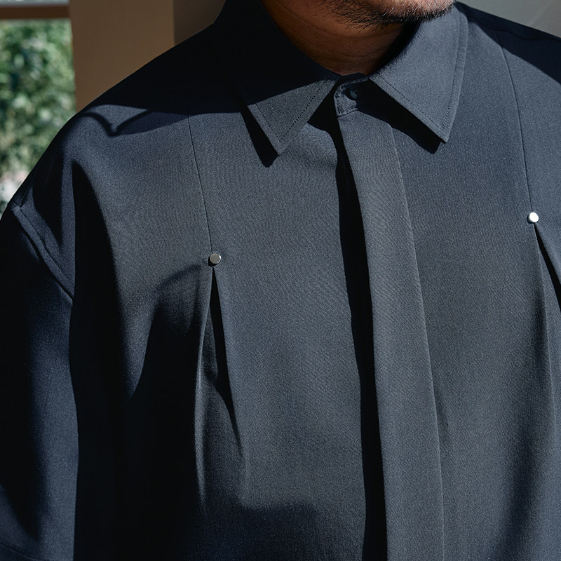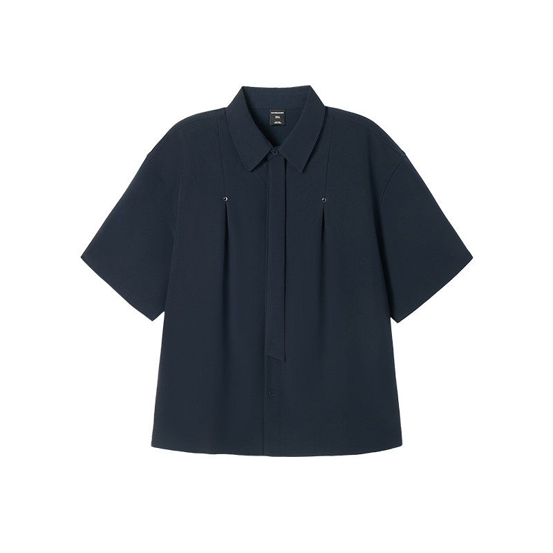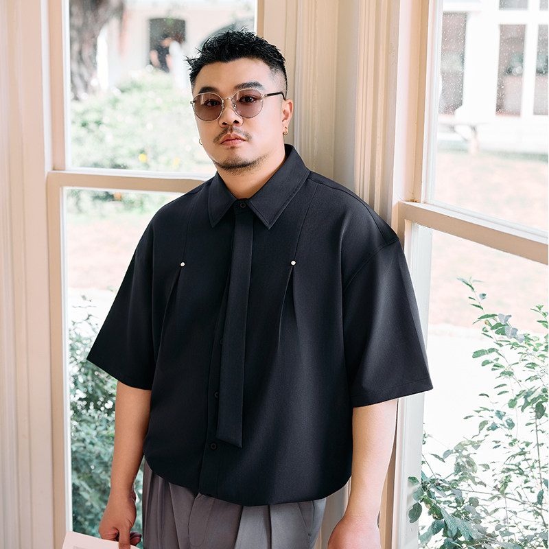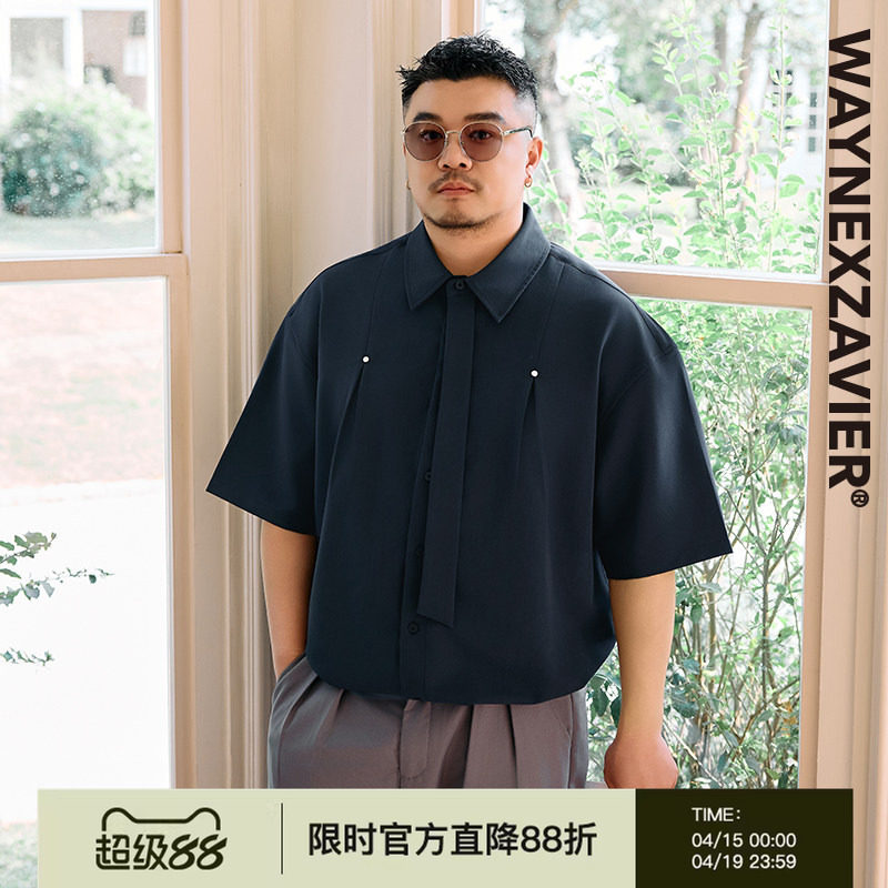 韦恩泽维尔加肥加大宽松大码男翻领显瘦遮胸装饰领带短袖衬衫9421