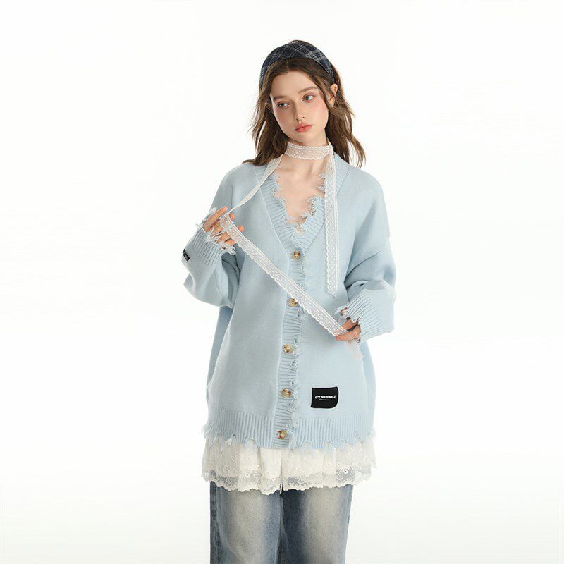 CyNi 设计感V领破坏针织开衫长款春秋女上衣2024秋针织衫外套高级