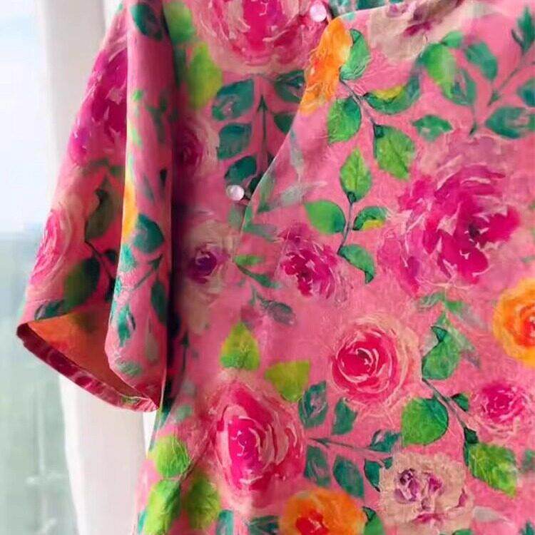 新中式玫瑰提花香云纱短袖衬衫女夏新款国潮风洋气唐装斜襟上衣