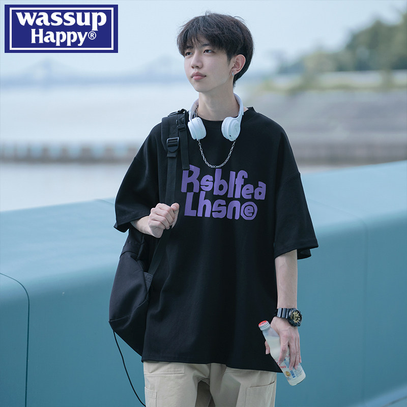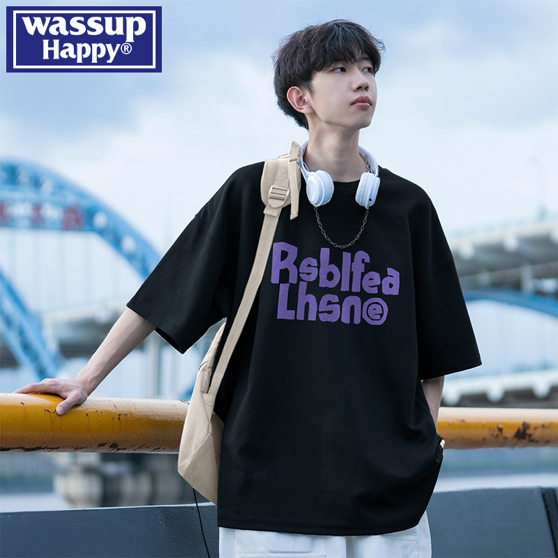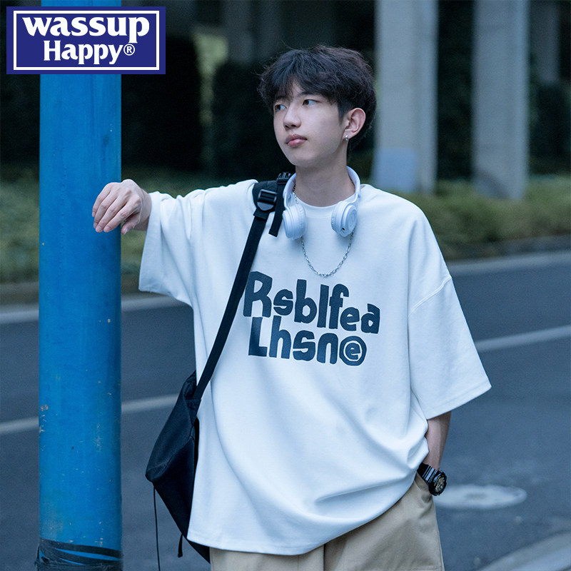 wassup happy圆领短袖t恤男2025夏季新款美式重磅宽松半袖体恤衫