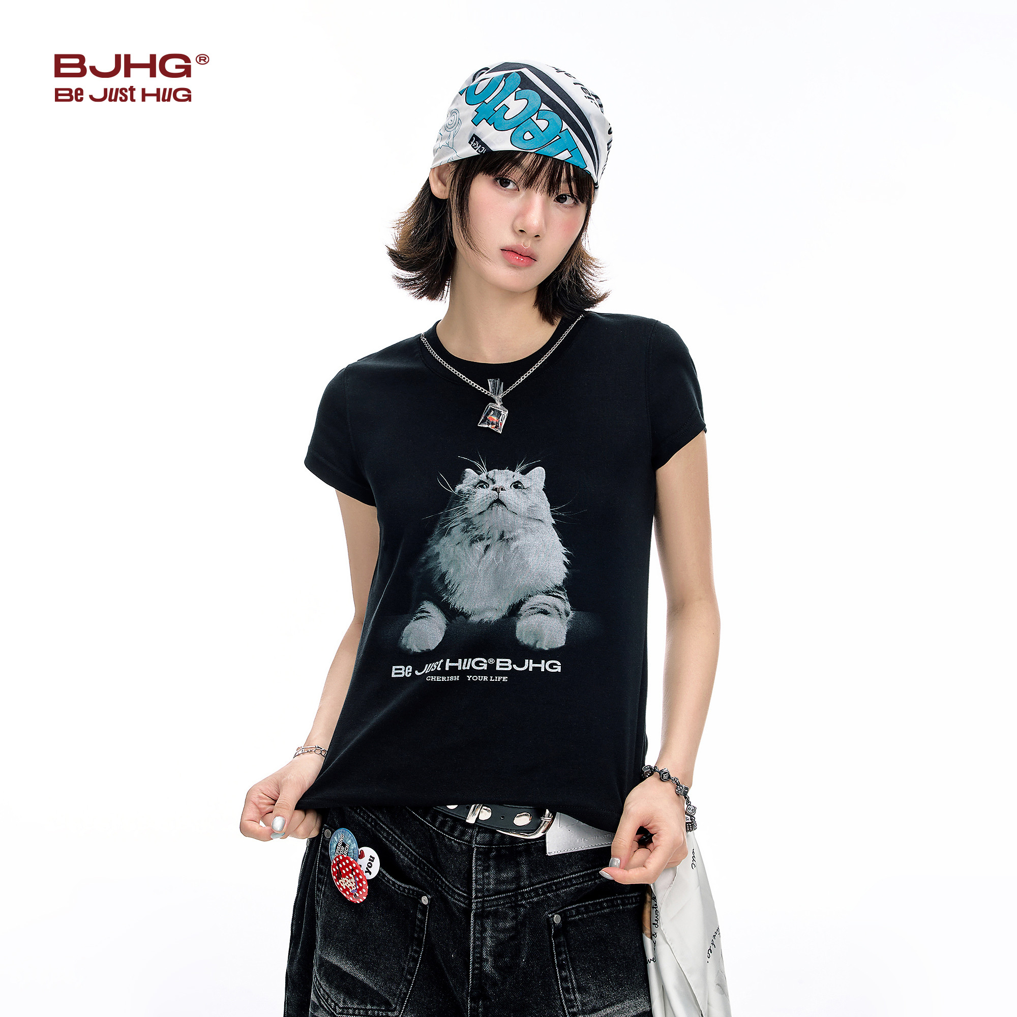BJHG不计后果 小猫圆领短款T恤女2025夏季新款潮休闲正肩短袖上衣