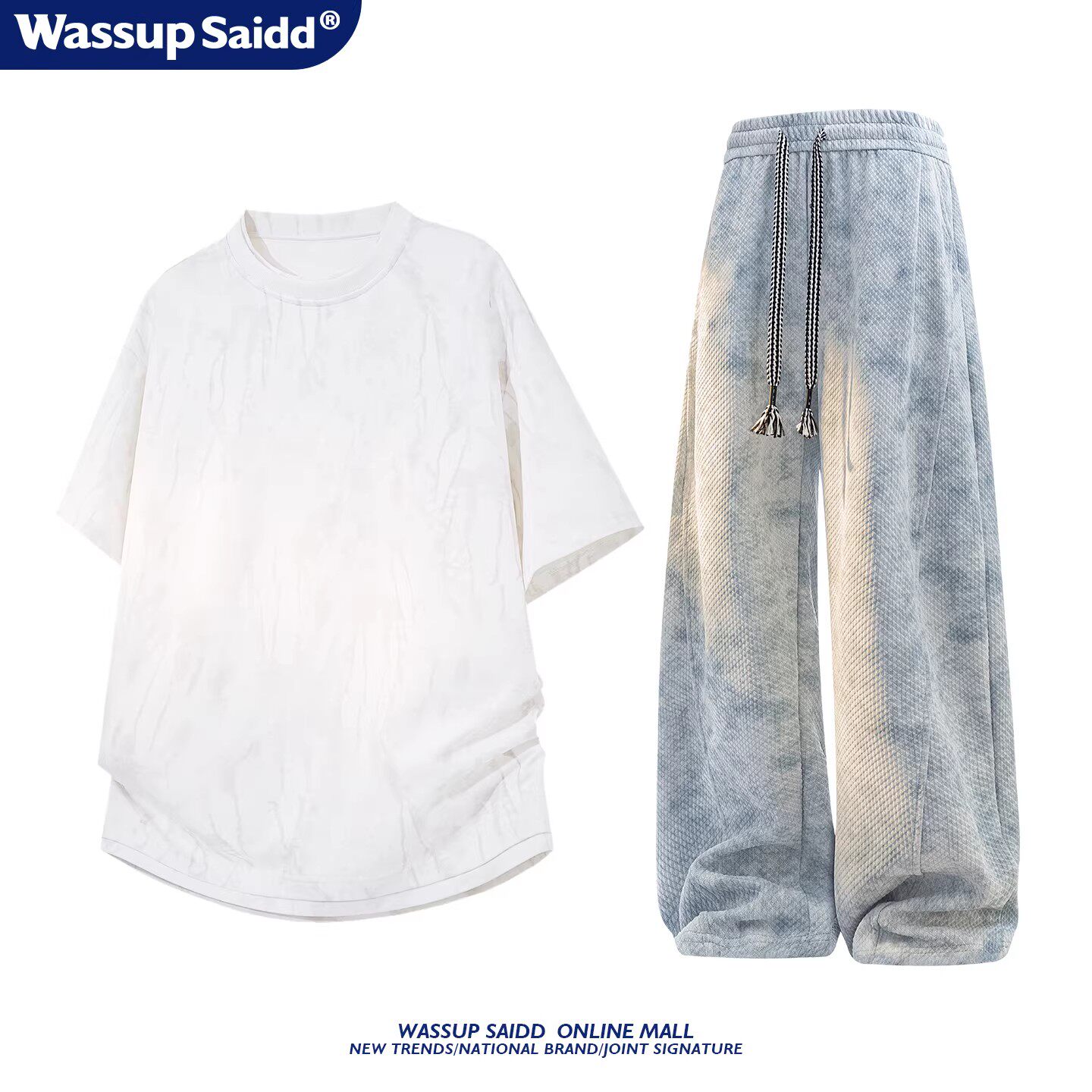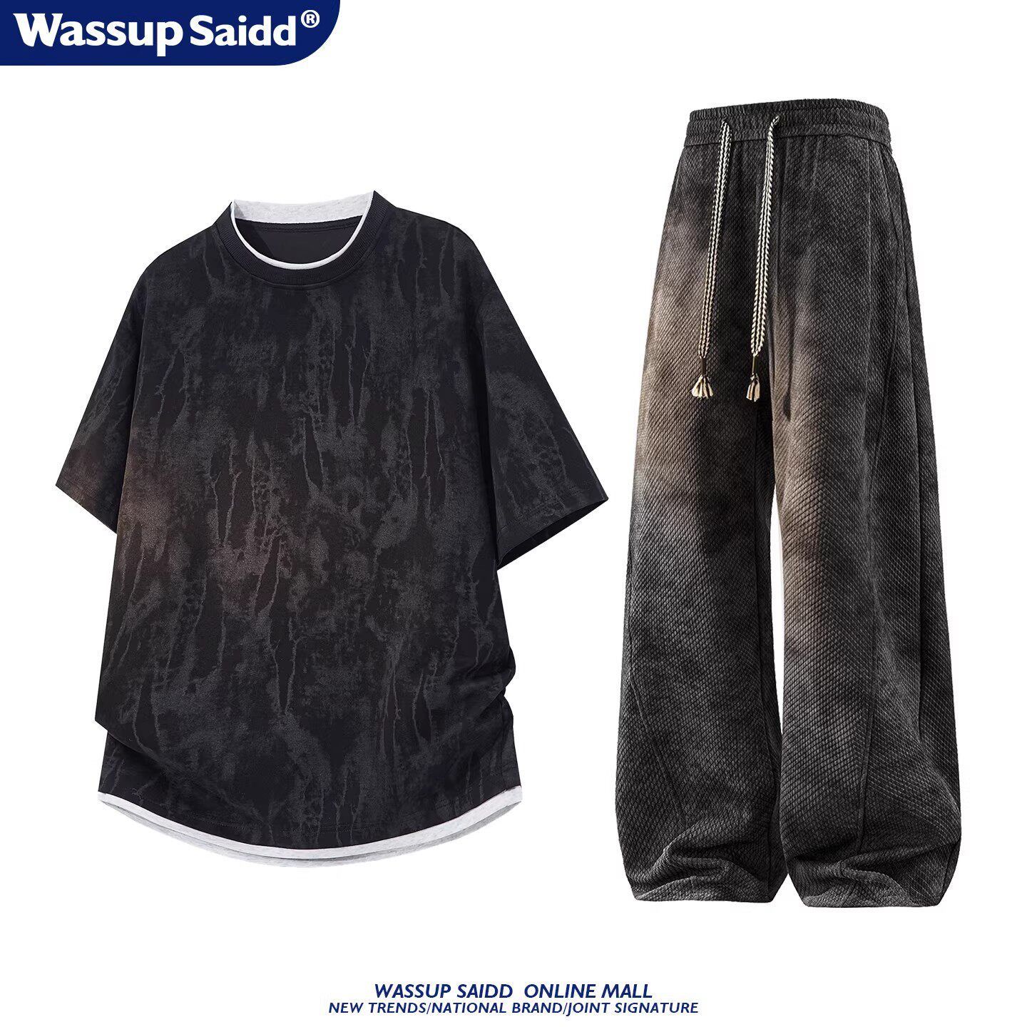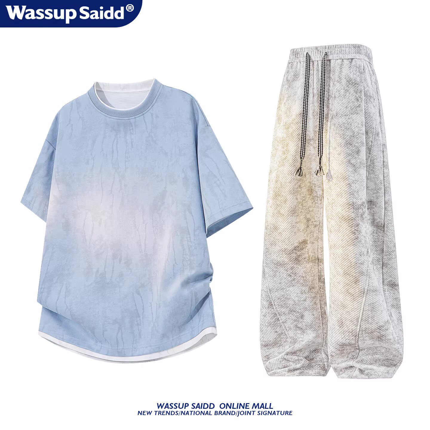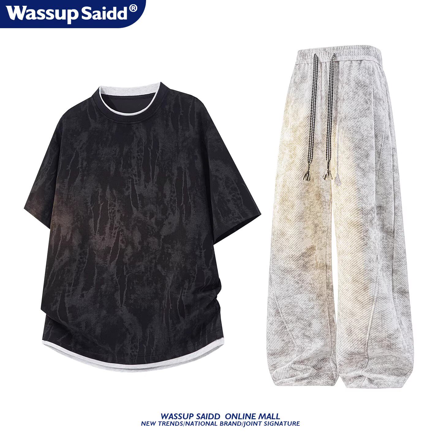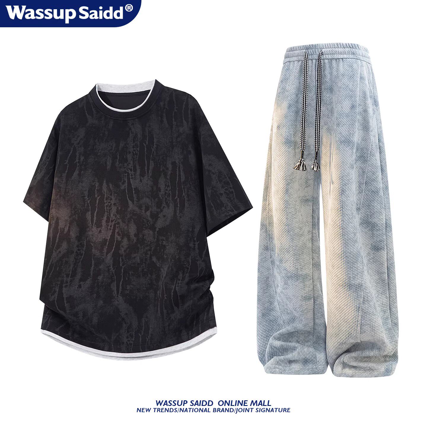 WASSUP SAIDD扎染假两件短袖男夏季休闲运动青少年长裤时尚套装