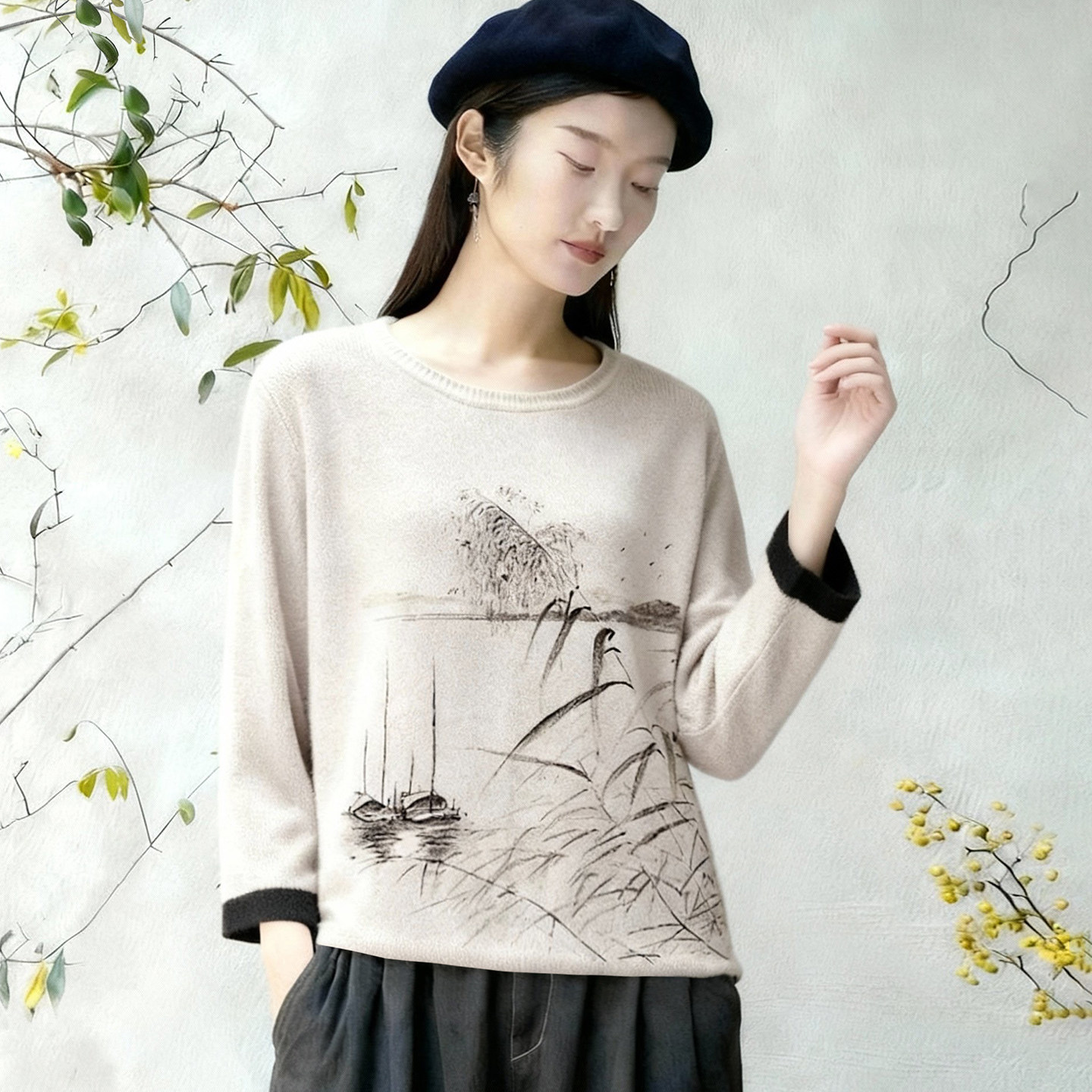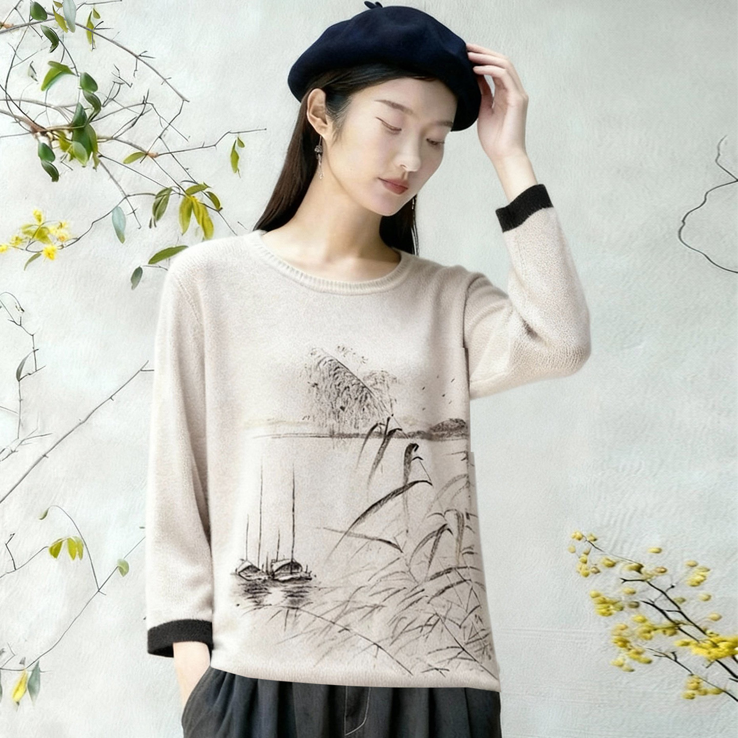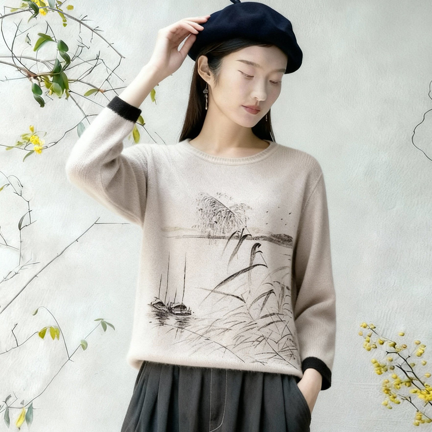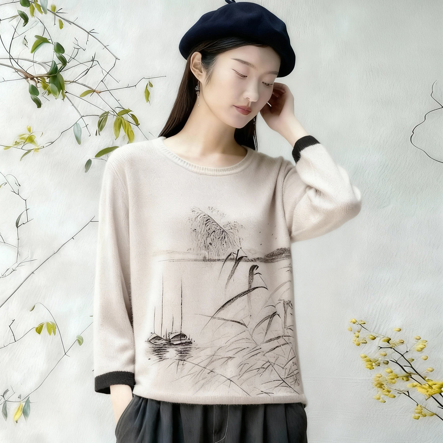 水墨沐暖手绘100%棉细腻亲肤纯棉新中式针织毛衣新中式上衣打底衫