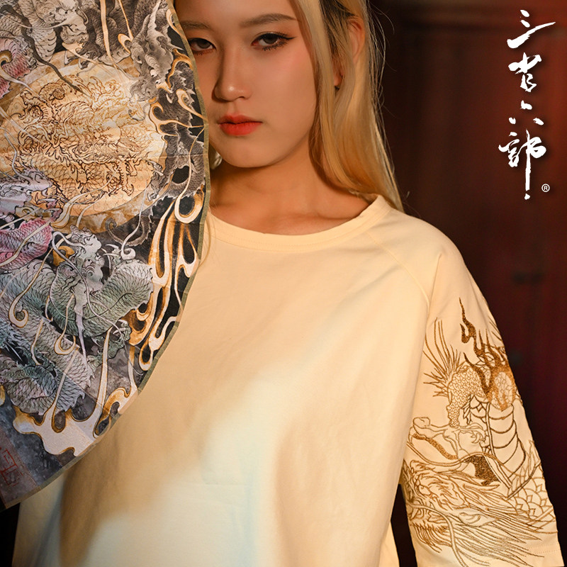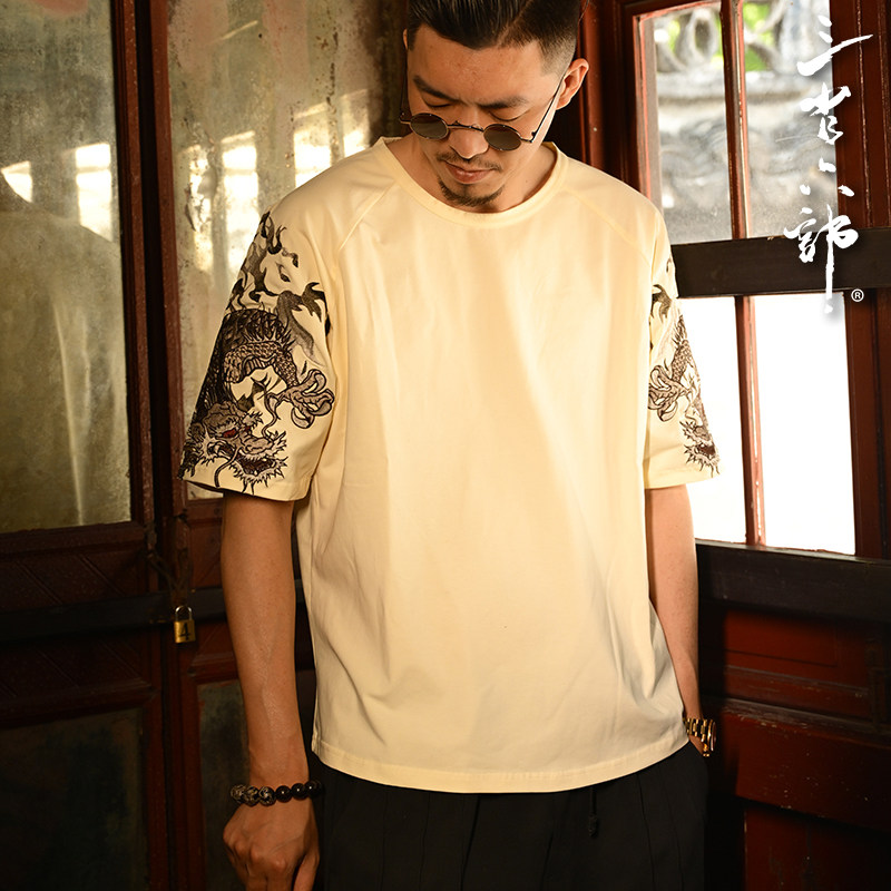 淘宝三省六部·兵部【九霄】夏季中国风双龙刺绣插肩袖男士宽松短袖