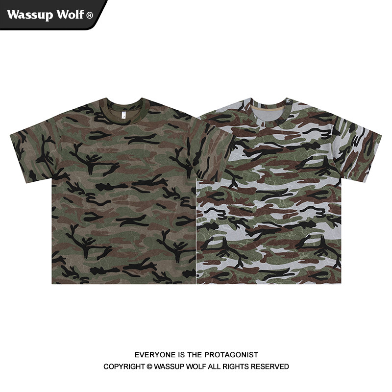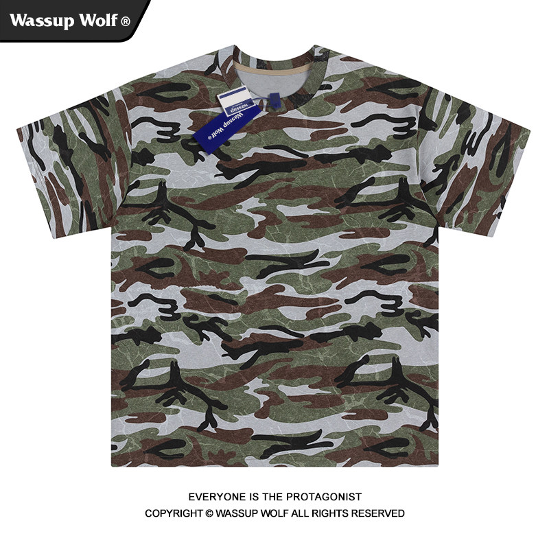 Wassup Wolf美式复古迷彩短袖t恤男潮牌重磅纯棉夏季2025新款半袖