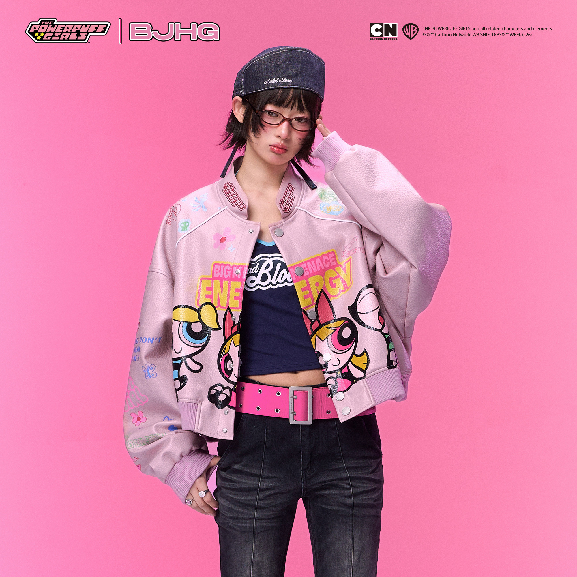 【飞天小女警联名】BJHG不计后果短款皮衣外套女春印花棒球服夹克