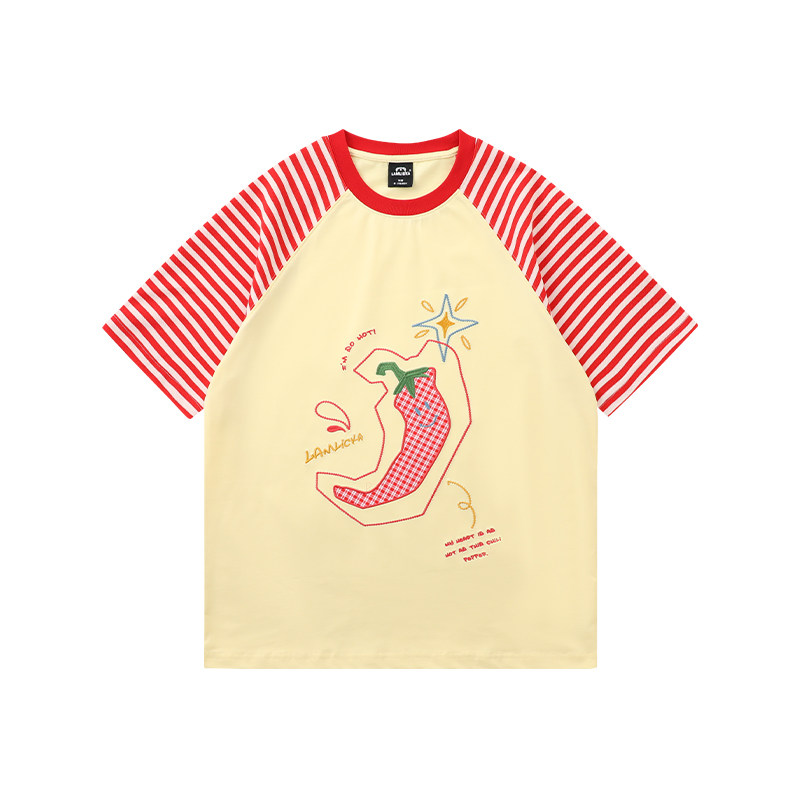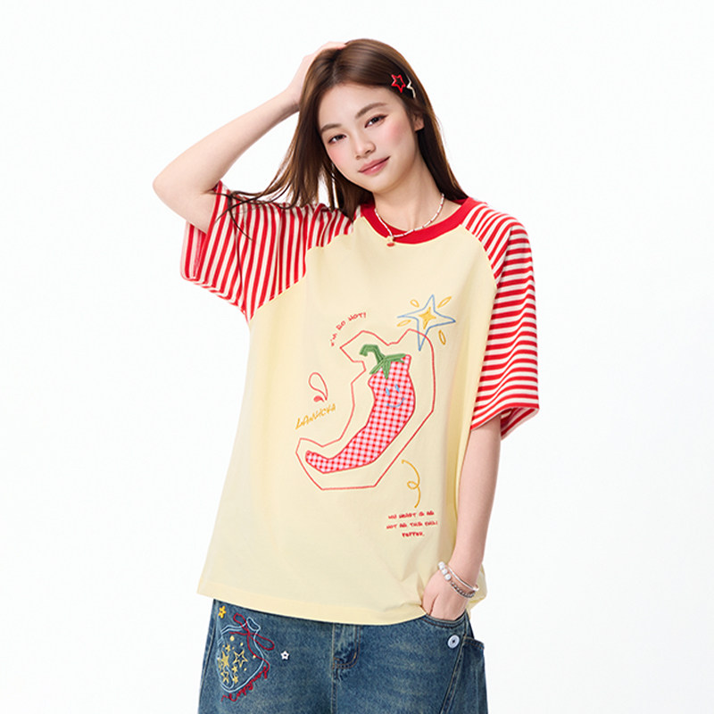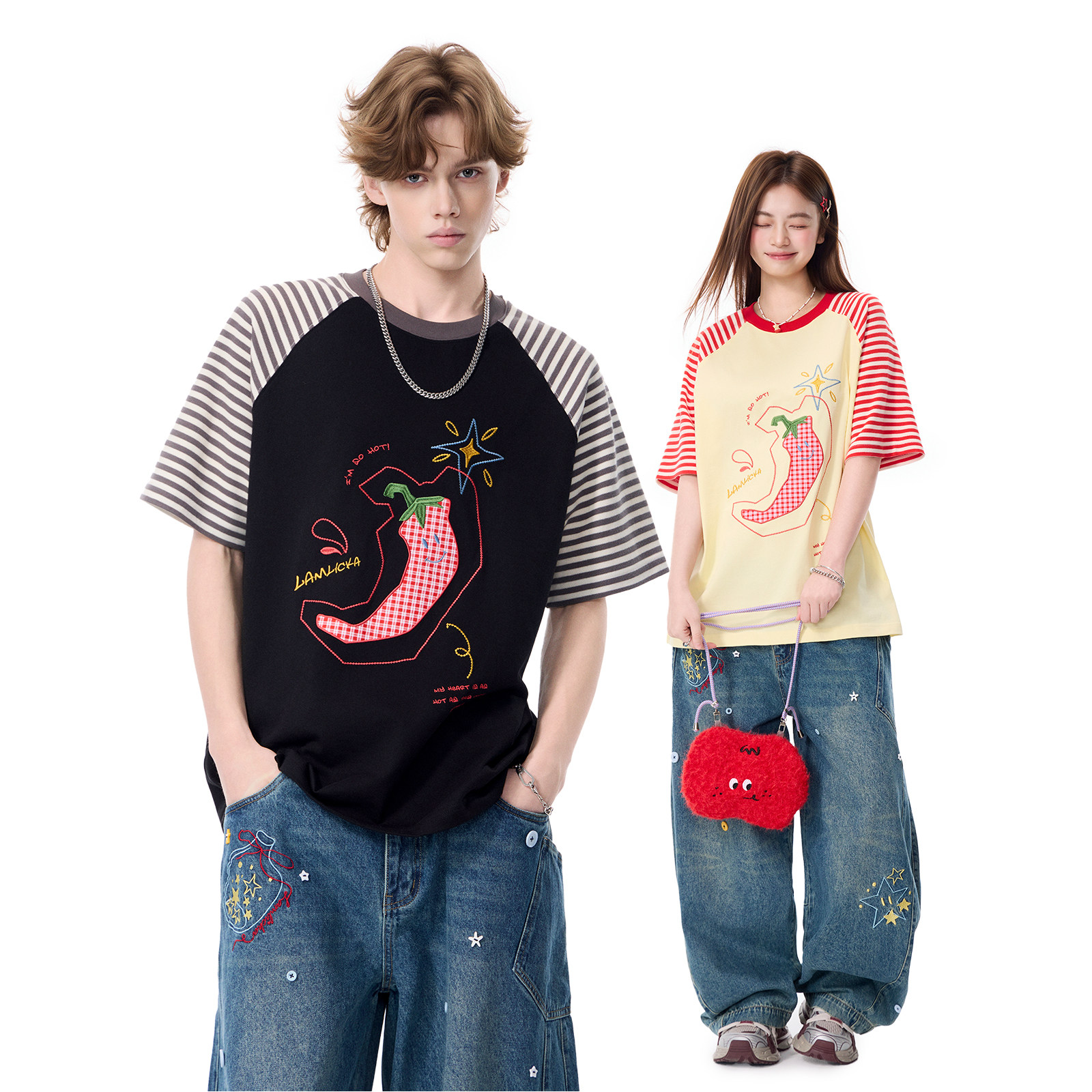 LAMLICKA辣椒贴布绣花T恤宽松慵懒风重磅圆领上衣ins插肩短袖凉感