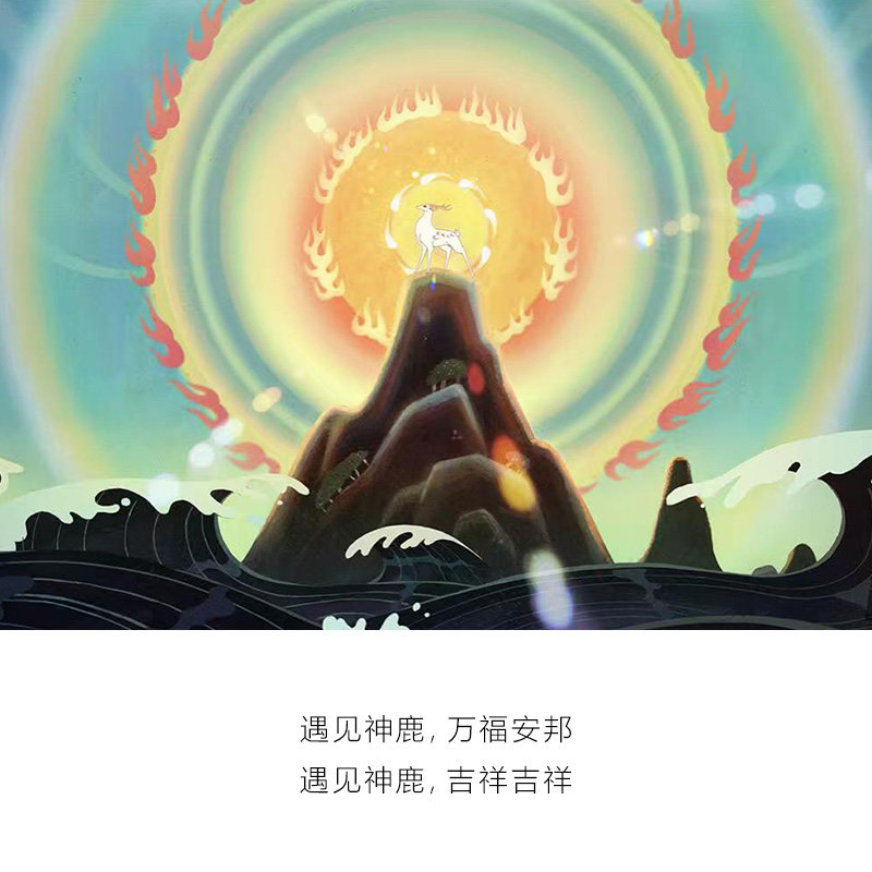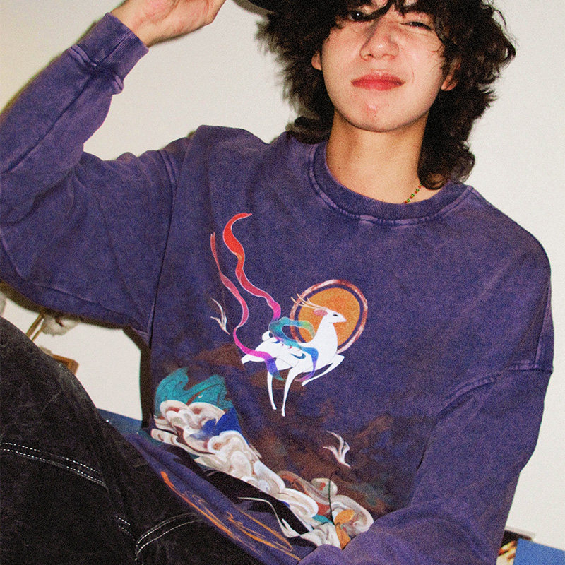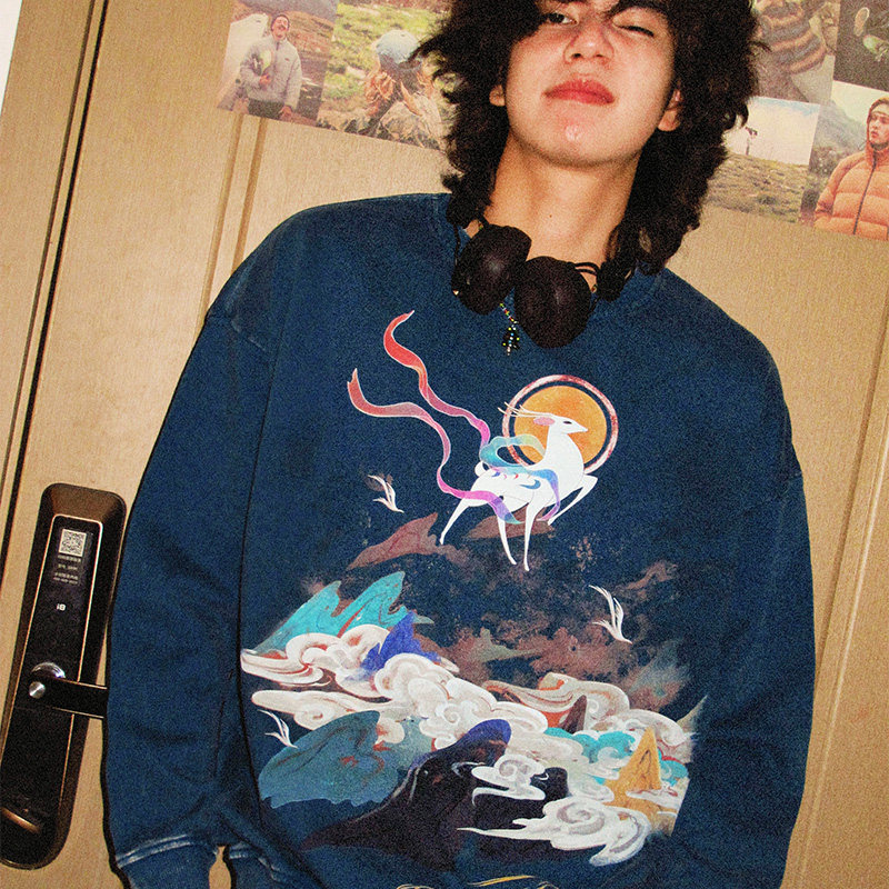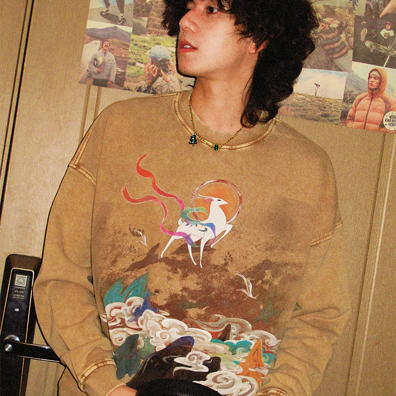 淘宝TEE7-国潮九色鹿水墨画新中式复古重磅纯棉圆领卫衣秋冬水洗做旧