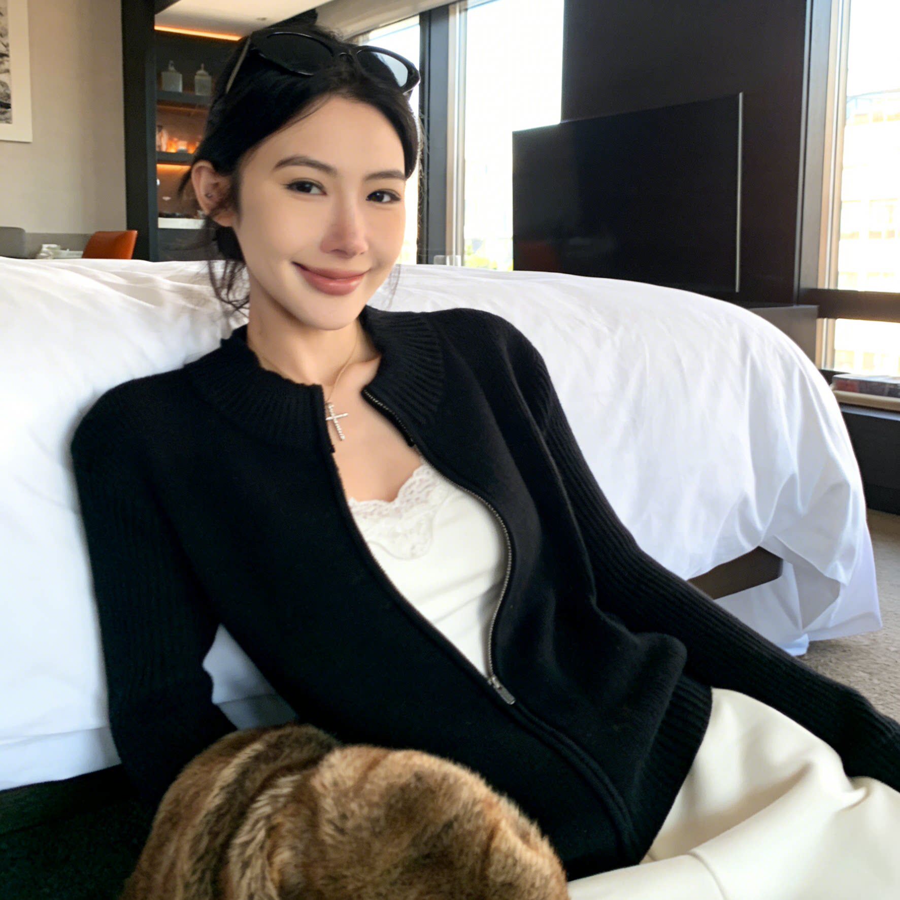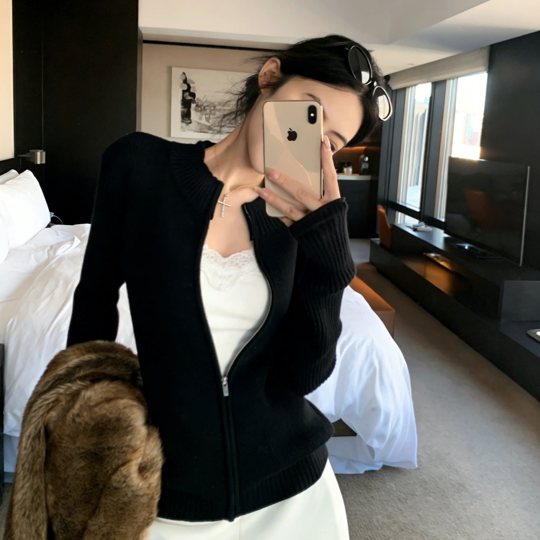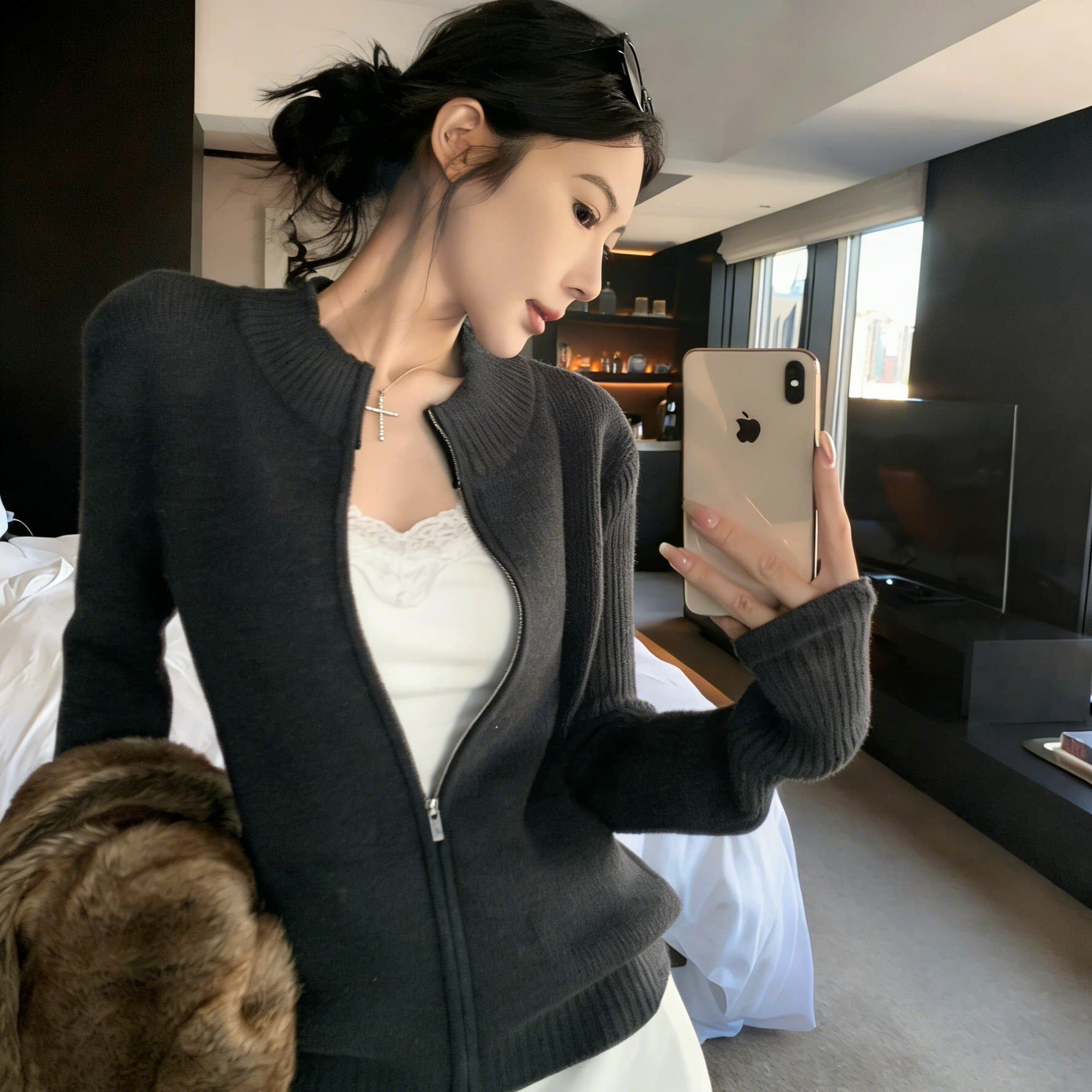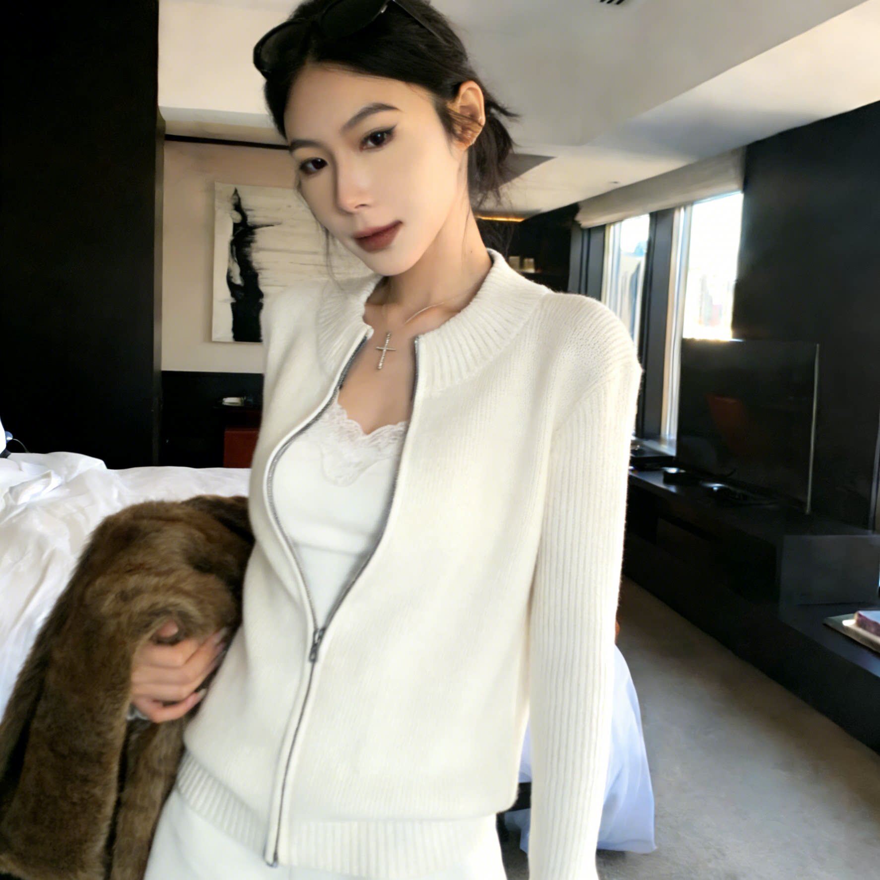 美式立领拉链针织开衫女春秋老钱风穿搭修身显瘦毛衣外套长袖上衣