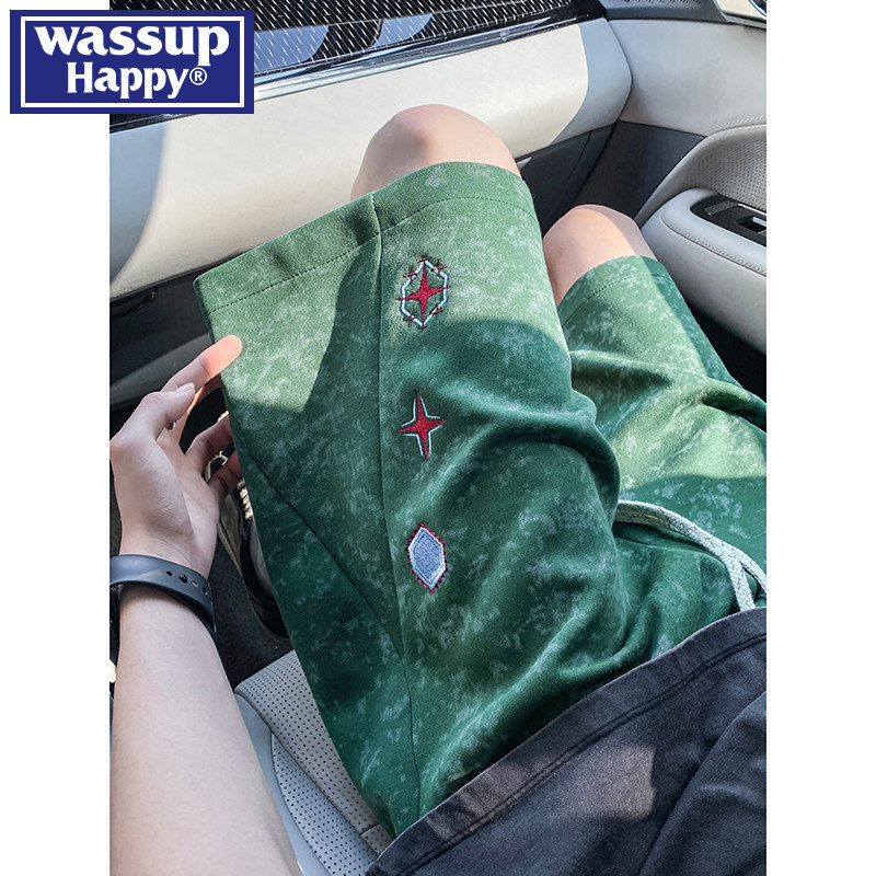 wassup happy美式刺绣扎染短裤男士夏季重磅慵懒风宽松五分沙滩裤