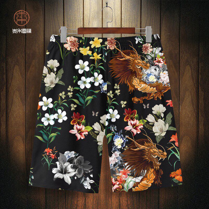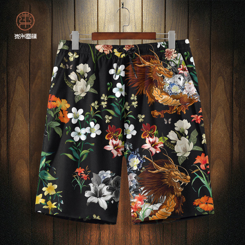 中国风短裤男士夏季大码宽松龙印花冰丝五分裤国潮休闲薄款沙滩裤