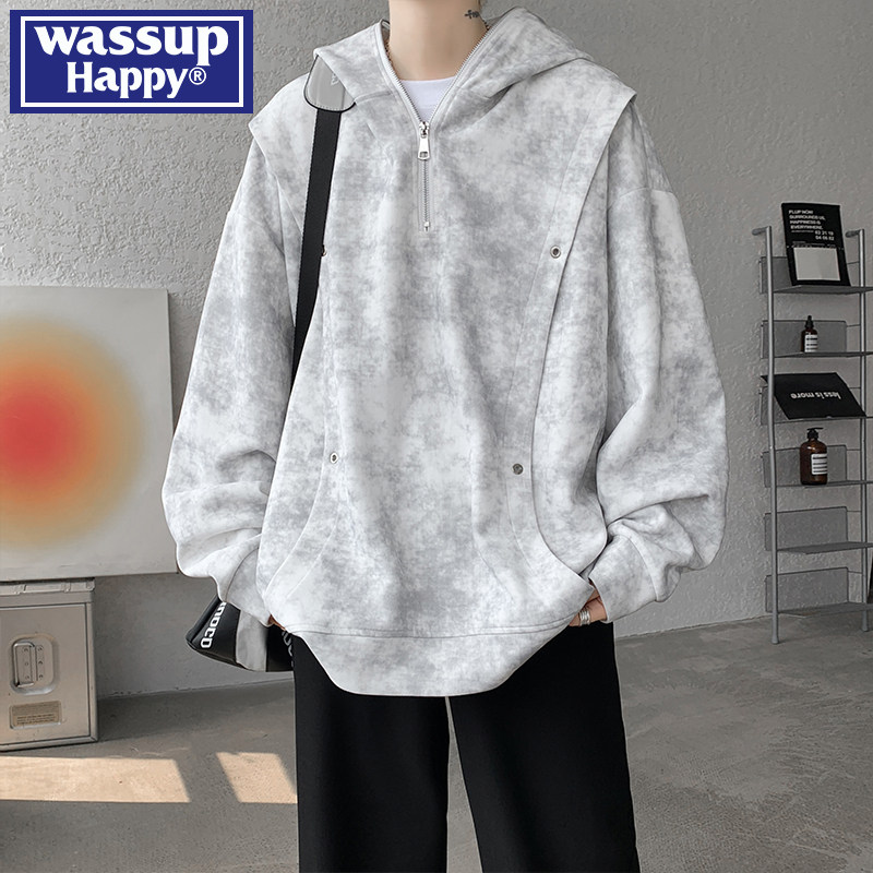 wassup happy重磅扎染连帽卫衣男士春秋季2026新款宽松休闲外套潮