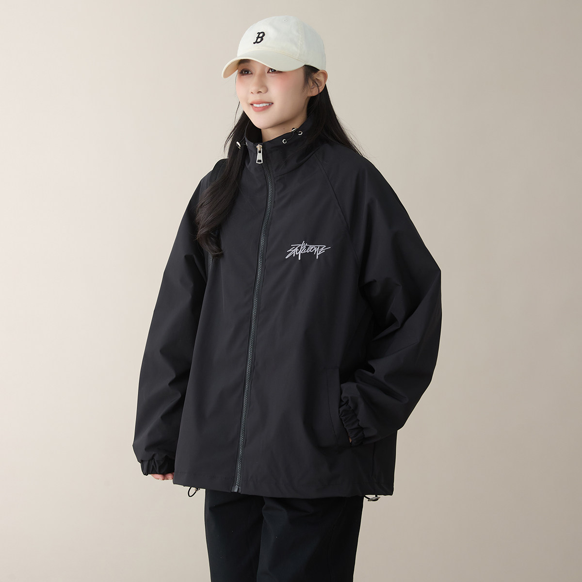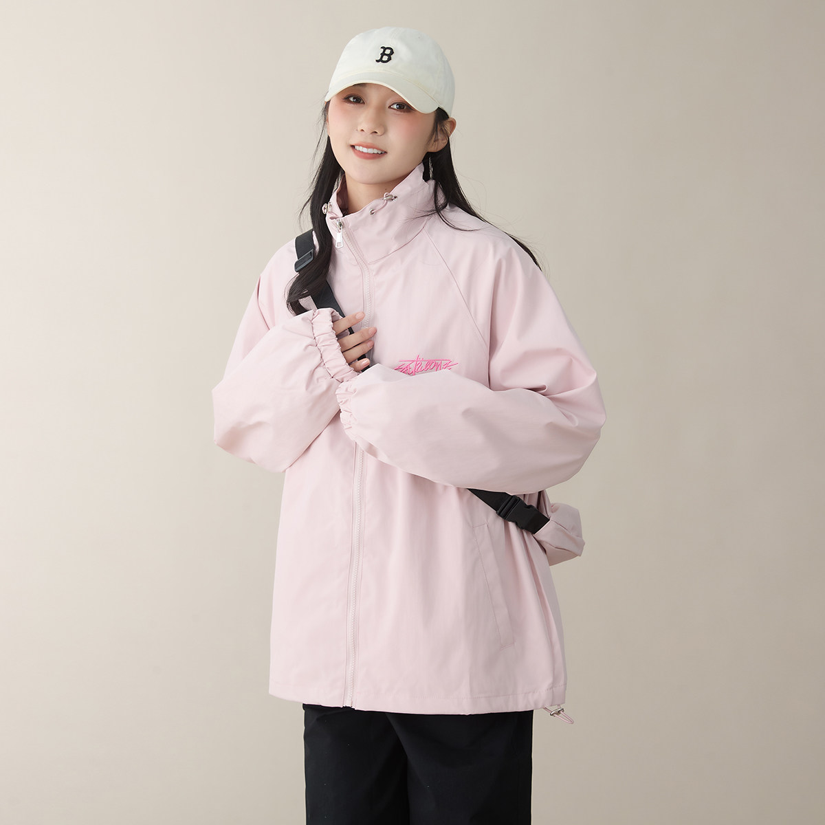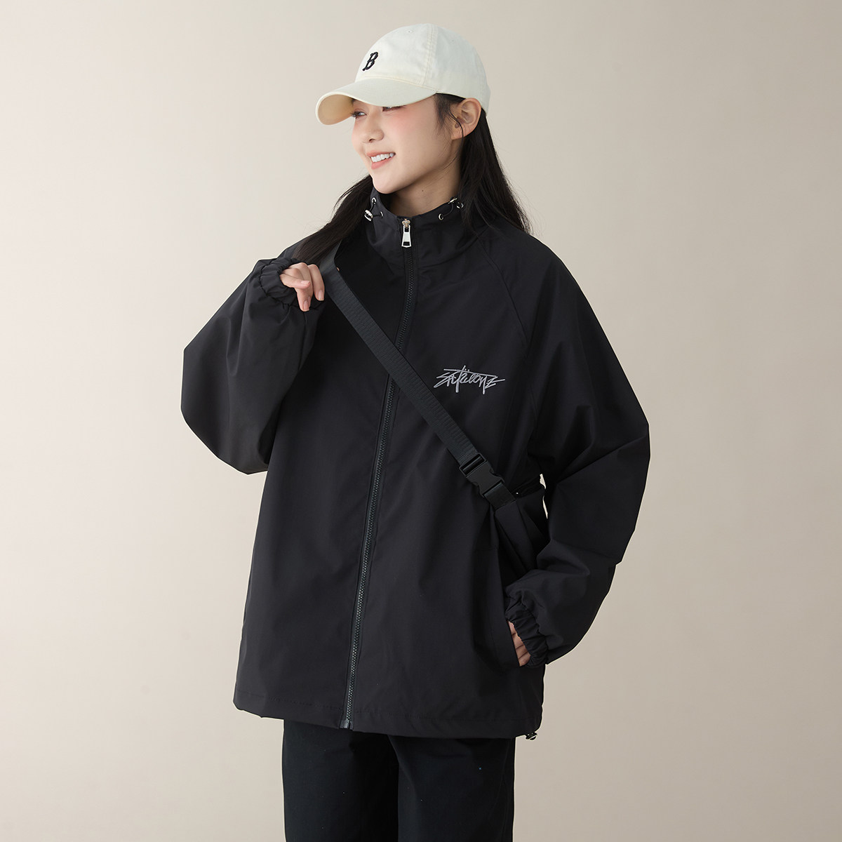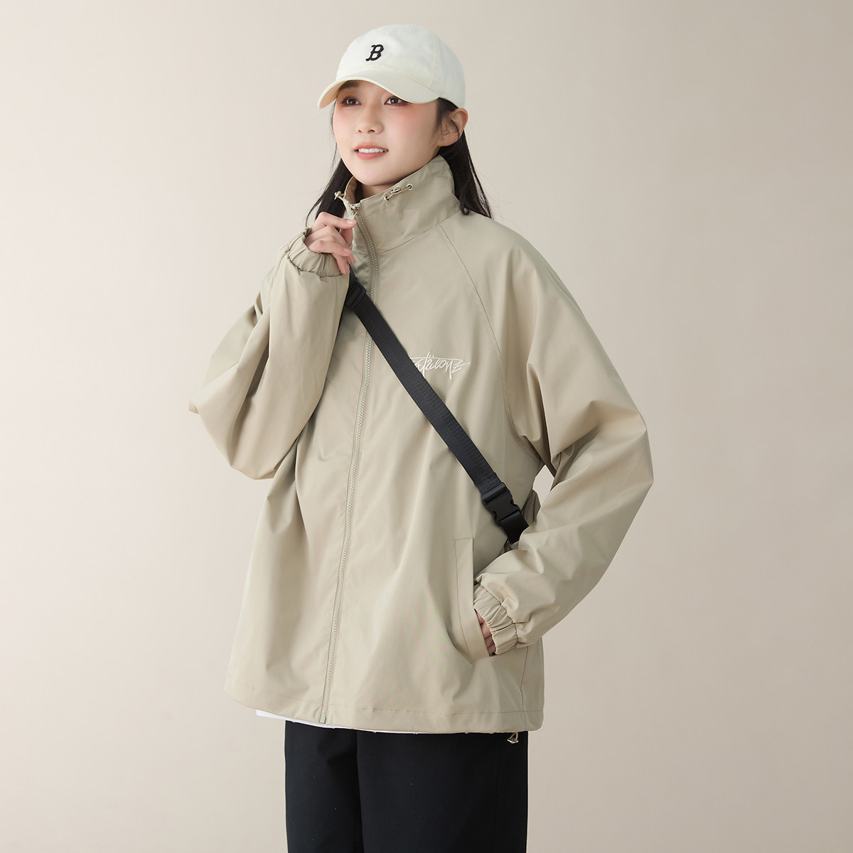 春秋户外休闲外套女刺绣字母无帽立领极简百搭冲锋衣夹克(含挎包