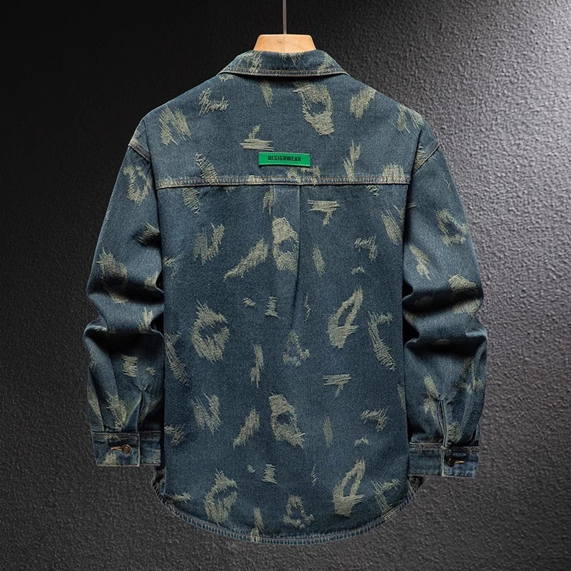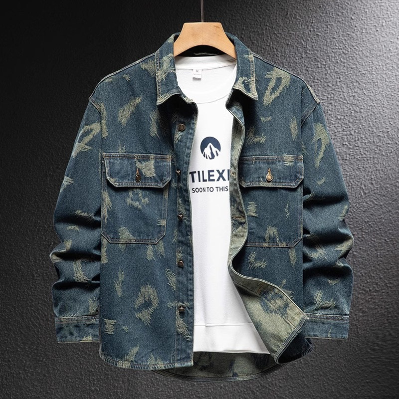 潮牌牛仔夹克外套男春秋季2025新款休闲宽松复古提花帅气轻奢衬衫