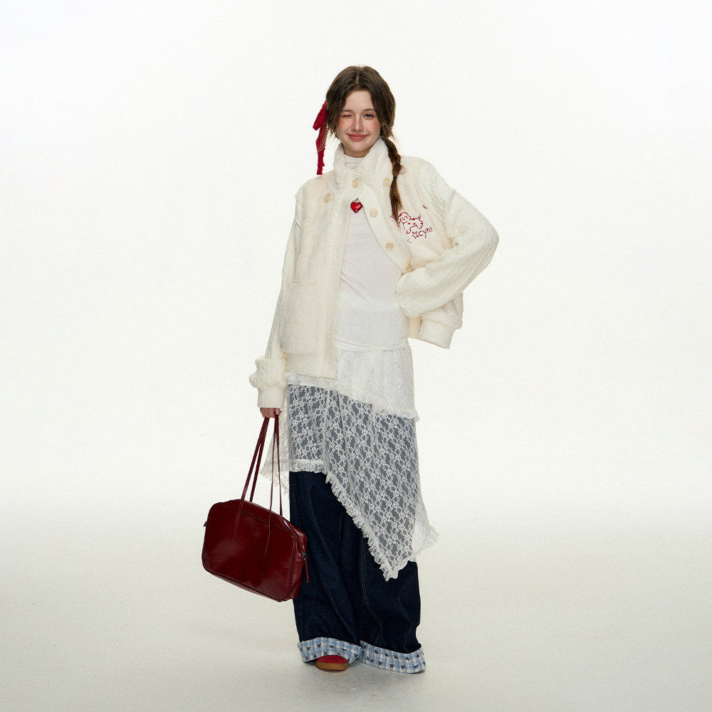 CyNi 甜美针织拼接兔毛外套上衣夹棉开 衫加绒加厚2024冬软糯温柔