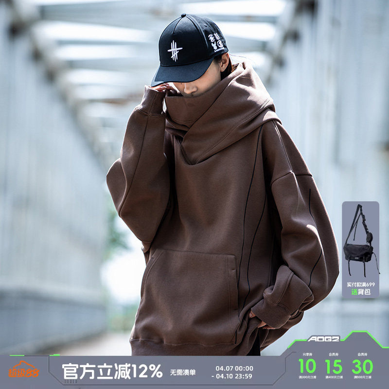 AOGZ国潮牌高领社恐卫衣男女秋冬新款重磅加绒加厚连帽情侣外套潮
