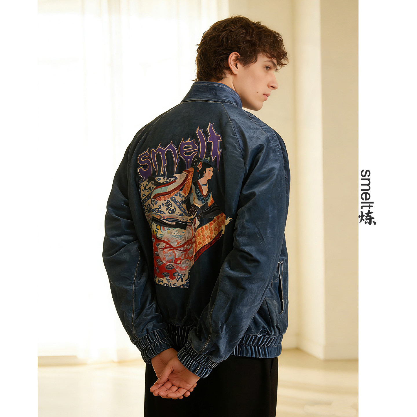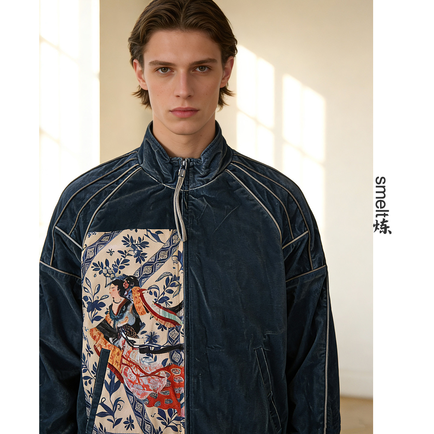 浮世曼波中式复古金丝绒立领男女通用宽松印花拉链外套棒球服国潮