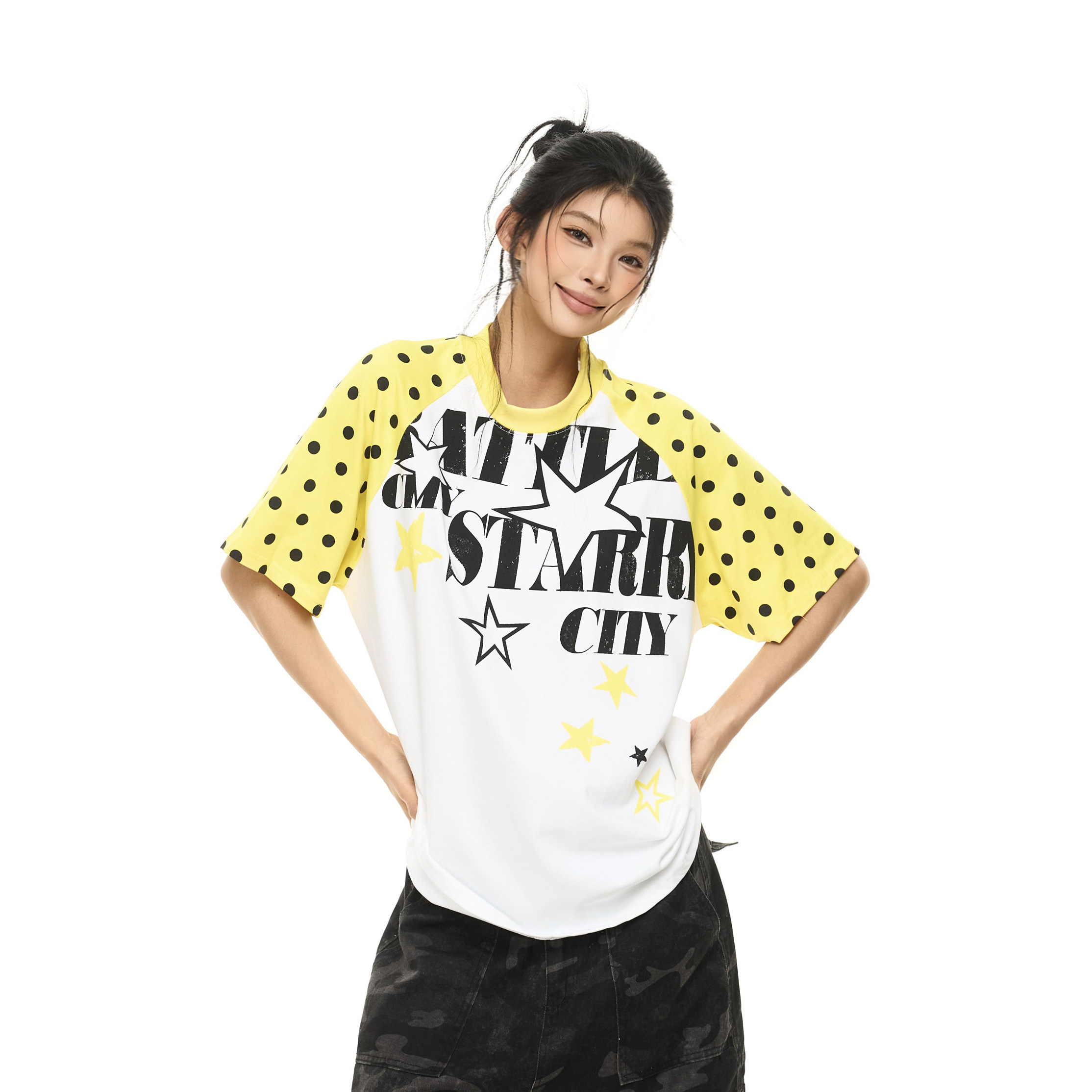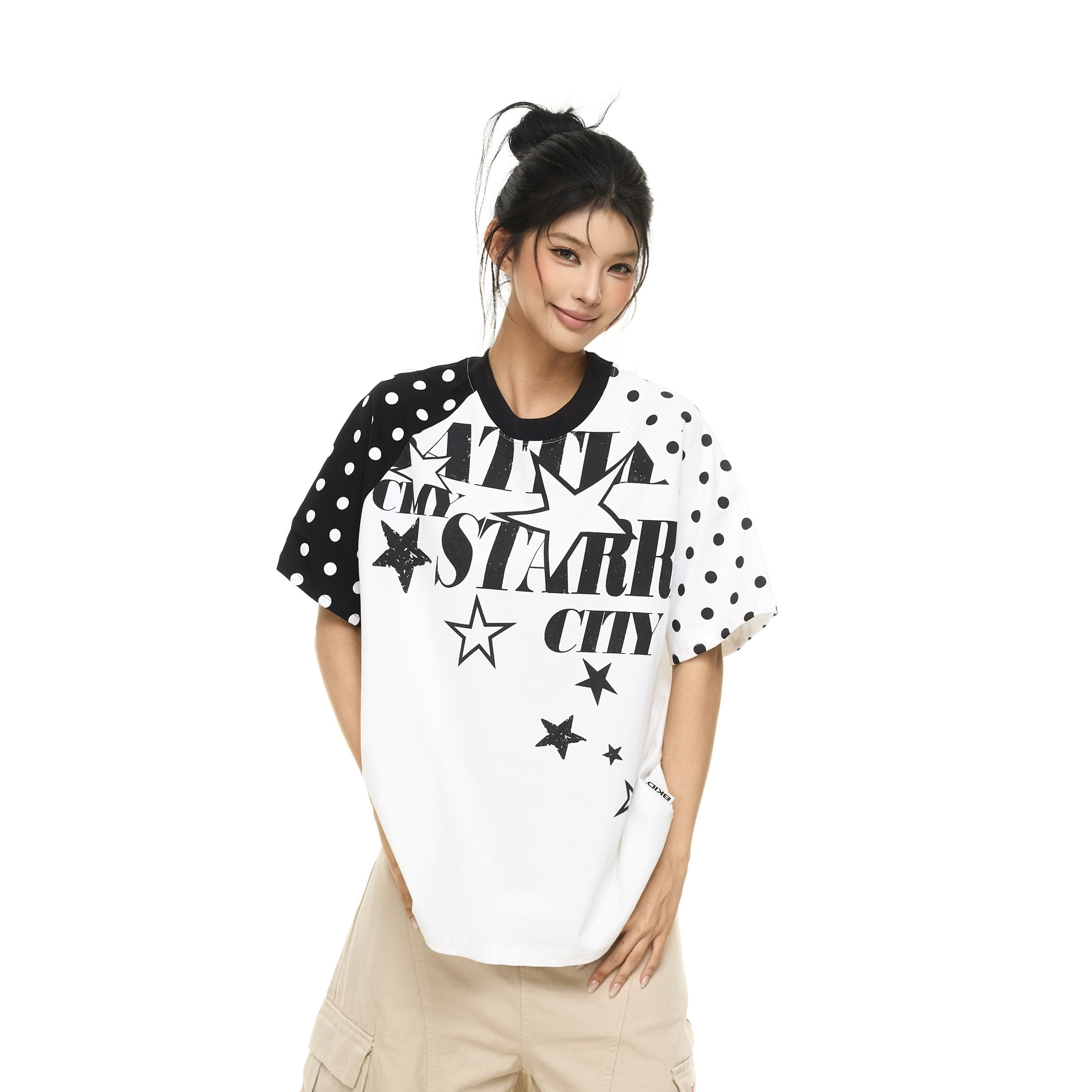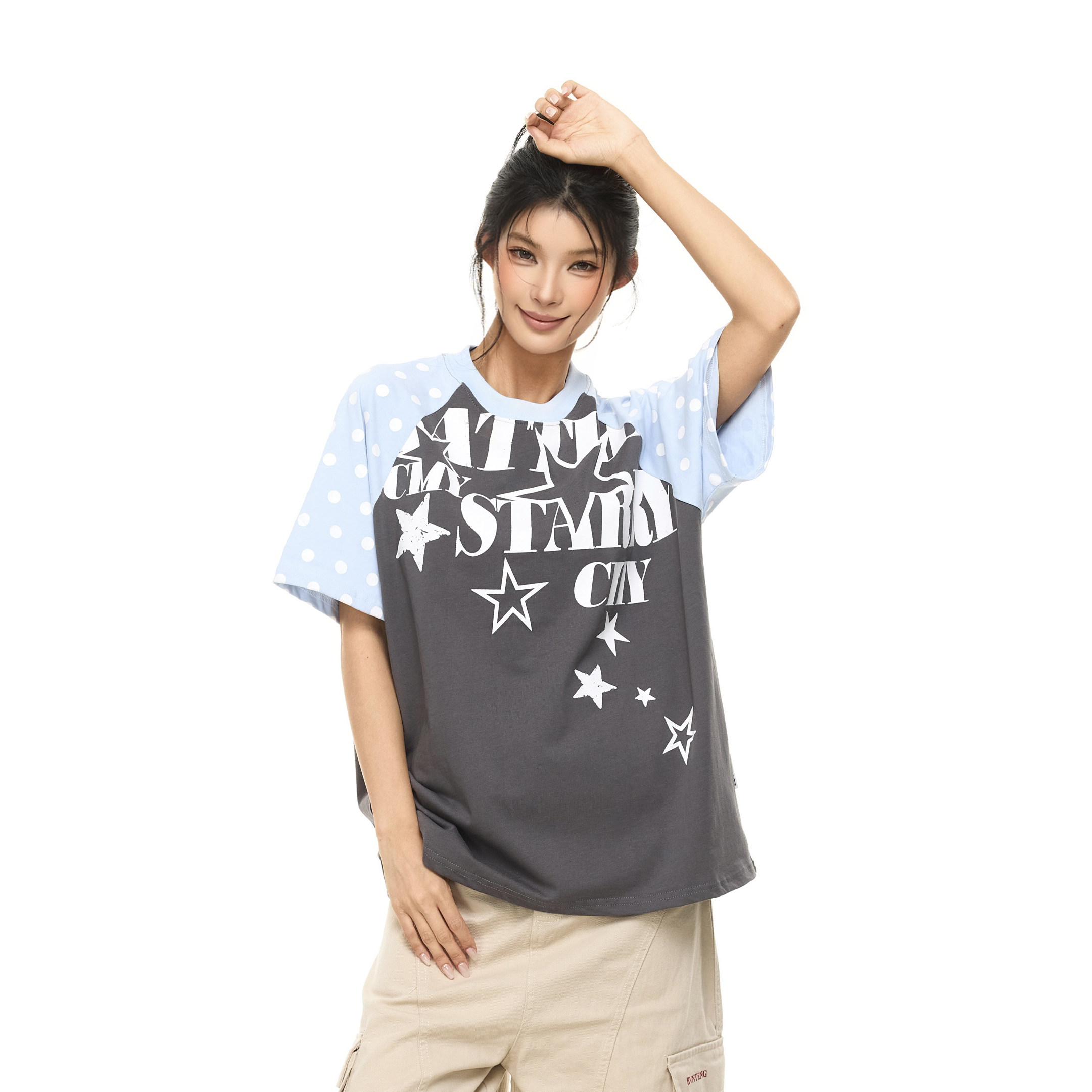 零碎岛屿美式撞色波点插肩袖短袖T恤男女宽松字母印花百搭上衣潮